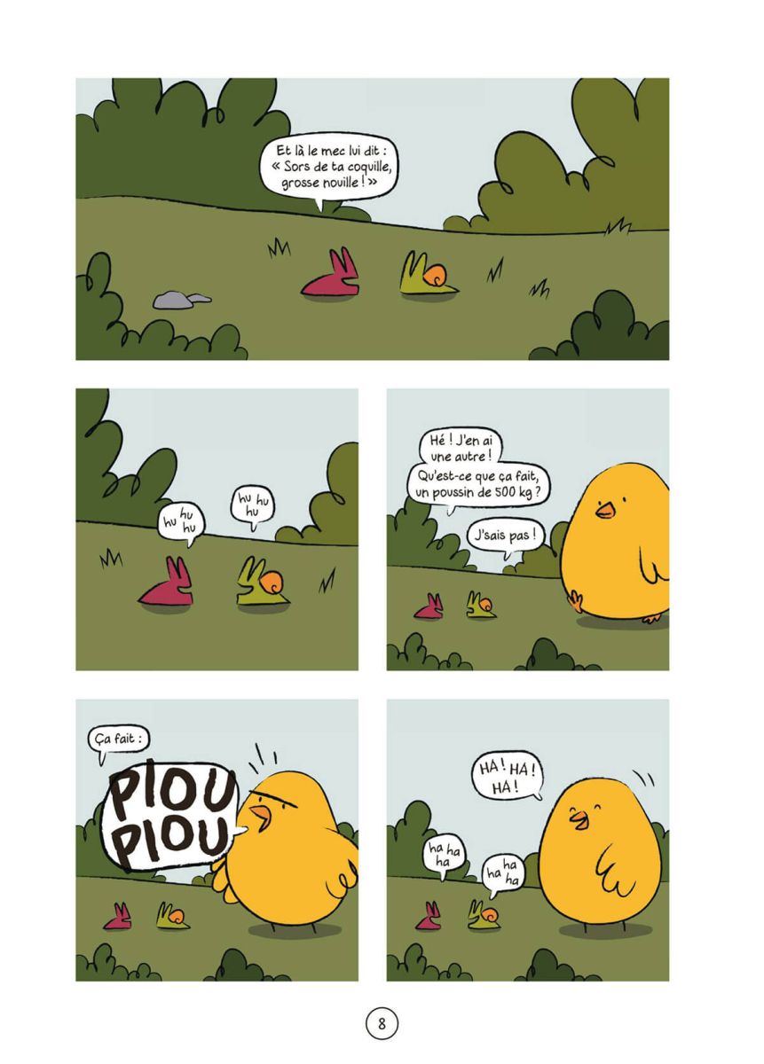 Le bestiaire, familier, est aussi unique en son genre : un lapin convaincu de faire régner la terreur, un duo d’escargots et de limaces toxicos, un poussin de 500 kilos qui ne connait pas sa force (ni son poids), une famille de Beloups (mi-belette, mi-loup) persuadée d’être les prédateurs ultimes, un ornithorynque naïf... qui font de ce décor de comptine un récit irrésistiblement et cruellement drôle.