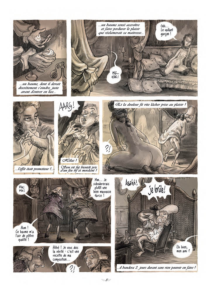 Dans la veine des classiques de la littérature libertine française du XVIIIe siècle, Lectures Frivoles est une petite merveille en textes et images, constituée de cinq historiettes délicieusement dessinées et élégamment rédigées : l’histoire d’un pari d’esprit fin (Lectures frivoles), celle d’une jeune héritière encouventée (La belle du couvent), l’initiation d’un jeune homme de bonne famille (Le jeune vit), d’une virée libertine (Le carrosse), où d’un pique-nique avec Monsieur Pan (Jeux d’extérieur).