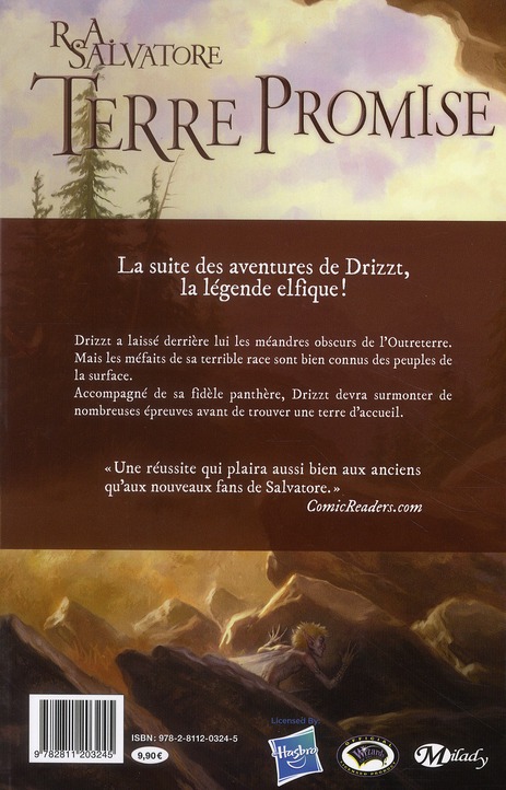 Terre promise est le volume 3 de la série Légende de Drizzt (La) par Andrew Dabb, Tim Seeley et R. A. Salvatore, paru en 2010. Selon nos informations, il n'en existe qu'une seule édition, publiée par Milady graphics.