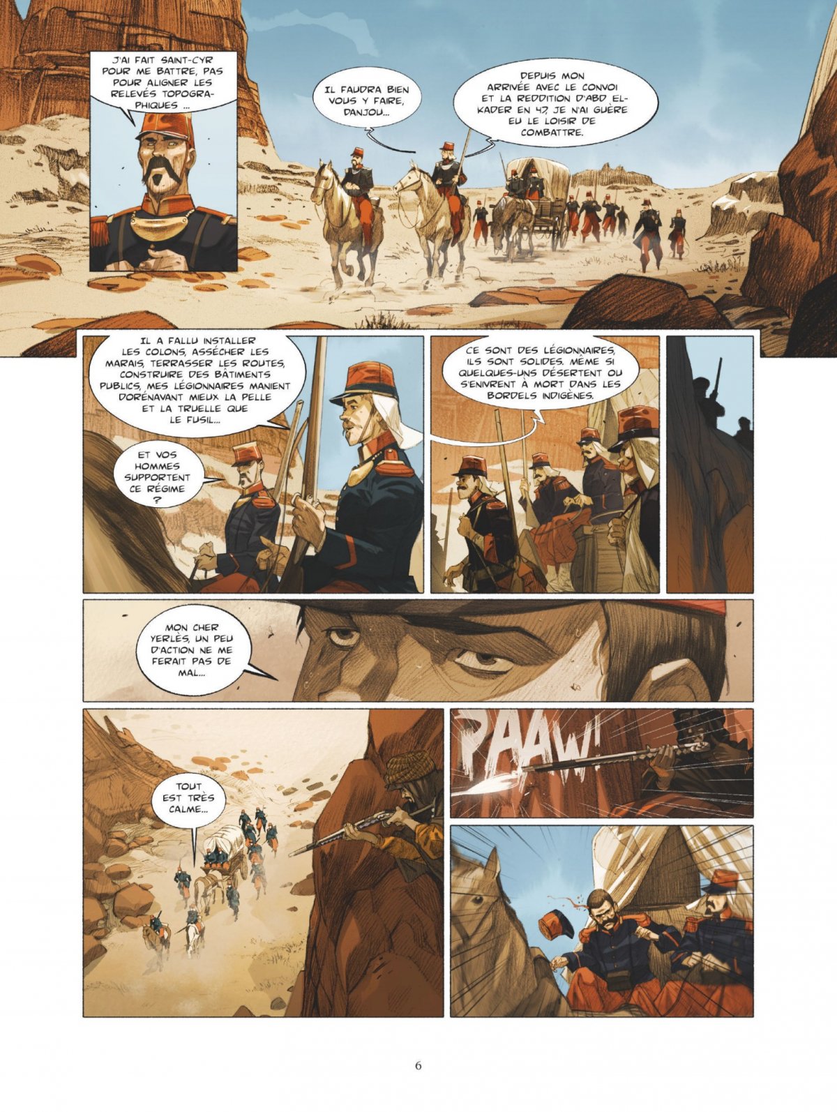 Le 30 avril 1863, l’honneur de la Légion étrangère s’écrit au Mexique, au cours de la bataille de Camerone, 62 légionnaires résistent pendant près de 12 heures aux assauts de plus de 2000 mexicains. En 5 volumes, Legio Patria Nostra explore le parcours initiatique du tambour Casimir Laï, un orphelin des rues qui va trouver sa place au sein de la Légion et devenir l’unique survivant de cette défaite militaire devenue une légende. Mais dans ce deuxième tome Main de bois, le Mexique est encore loin.Un an avant, en Algérie, à Sidi-Bel-Abbès, enrôlé sous une fausse identité, Casimir découvre la discipline de fer de la Légion aux côtés d’hommes venus de toute l’Europe chercher l’aventure et parfois l’oubli d’un passé criminel. Ces soldats, dont certains parlent à peine français, sont commandés par un capitaine manchot, Jean Danjou surnommé « Main de bois », qui n’aspire qu’à une chose, aller se battre au Mexique plutôt que de construire l’Algérie Française aux côtés des colons. Sous la chaleur, les coups et les privations, le capitaine Danjou tente de faire du gamin qui a grandi parmi les truands, un légionnaire. Mais Casimir, lui, ne rêve que de déserter et de retrouver sa Zélie dont il a perdu la trace en débarquant en Algérie. Rétif et violent au départ, il va découvrir que des liens indéfectibles se sont tissés avec ses camarades et qu’une seconde chance lui est offerte. Mais le petit voleur des ruelles marseillaises n’est pas encore prêt à devenir un légionnaire et quand il découvre que Zélie est enfermée dans une maison de passe de la ville, il sait qu’il va devoir faire un choix.