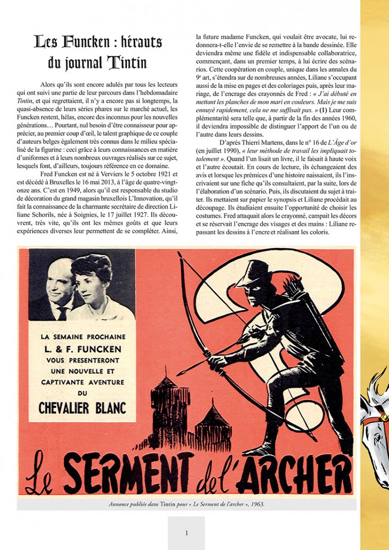 Dossier biographie illustré de 16 pages, écrit par Gilles Ratier et comprenant une biographie illustrée de Liliane et Fred Funcken, ainsi qu’une bibliographie exhaustive et une étude de la série Le Chevalier Blanc. Avec une texte de Didier Convard, une reproduction d’une lettre de Edgar P. Jacobs publiée pour la toute première fois, de nombreuses photos, et des documents inédits.