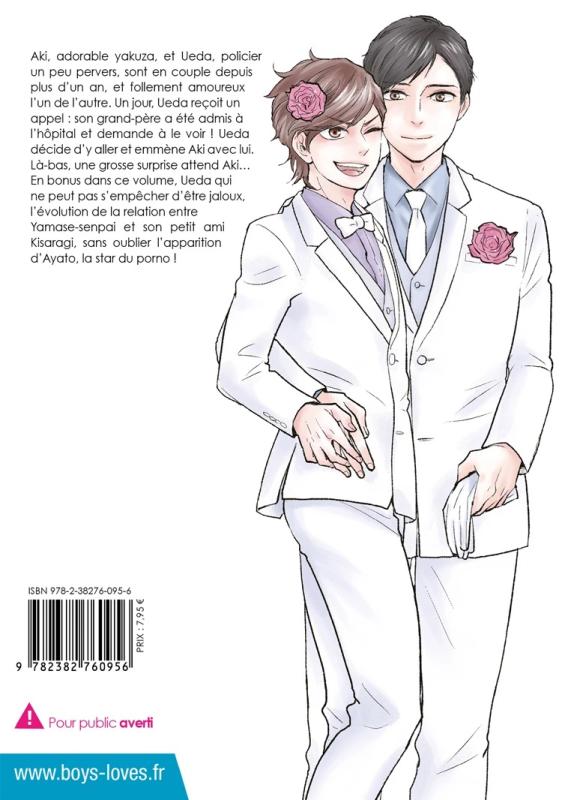 Aki, adorable yakuza, et Ueda, policier un peu pervers, sont en couple depuis plus d’un an, et follement amoureux l’un de l’autre. Un jour, Ueda reçoit un appel : son grand-père a été admis à l’hôpital et demande à le voir ! Ueda décide d’y aller et emmène Aki avec lui.Là-bas, une grosse surprise attend Aki...En bonus dans ce volume, Ueda qui ne peut pas s’empêcher d’être jaloux, l’évolution de la relation entre Yamase-sempai et son petit ami Kisaragi, sans oublier l’apparition d’Ayato, la star du porno !Un tome plein de tendresse, d’amour et de rebondissements !