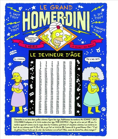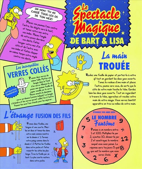 Si vous ne savez pas quoi faire de vos enfants ni comment meubler un dimanche après-midi pluvieux autrement qu’en restant affalé devant la télé avec une bière (façon Homer Simpson), ce cahier d’activités aussi drôle et efficace que parfaitement déjanté est fait pour vous ! Vous y trouverez à chaque page nombre d’idées étonnantes pour vous divertir en compagnie de la famille Simpson : les tours de magie de Bart, le mini-golf ainsi qu’une flopée d’activités manuelles, jeux de cartes, labyrinthes, énigmes, pliages, bref toute une panoplie ludique pour petits et grands.De quoi animer une fête d’anniversaire ou passer un bon moment en famille.