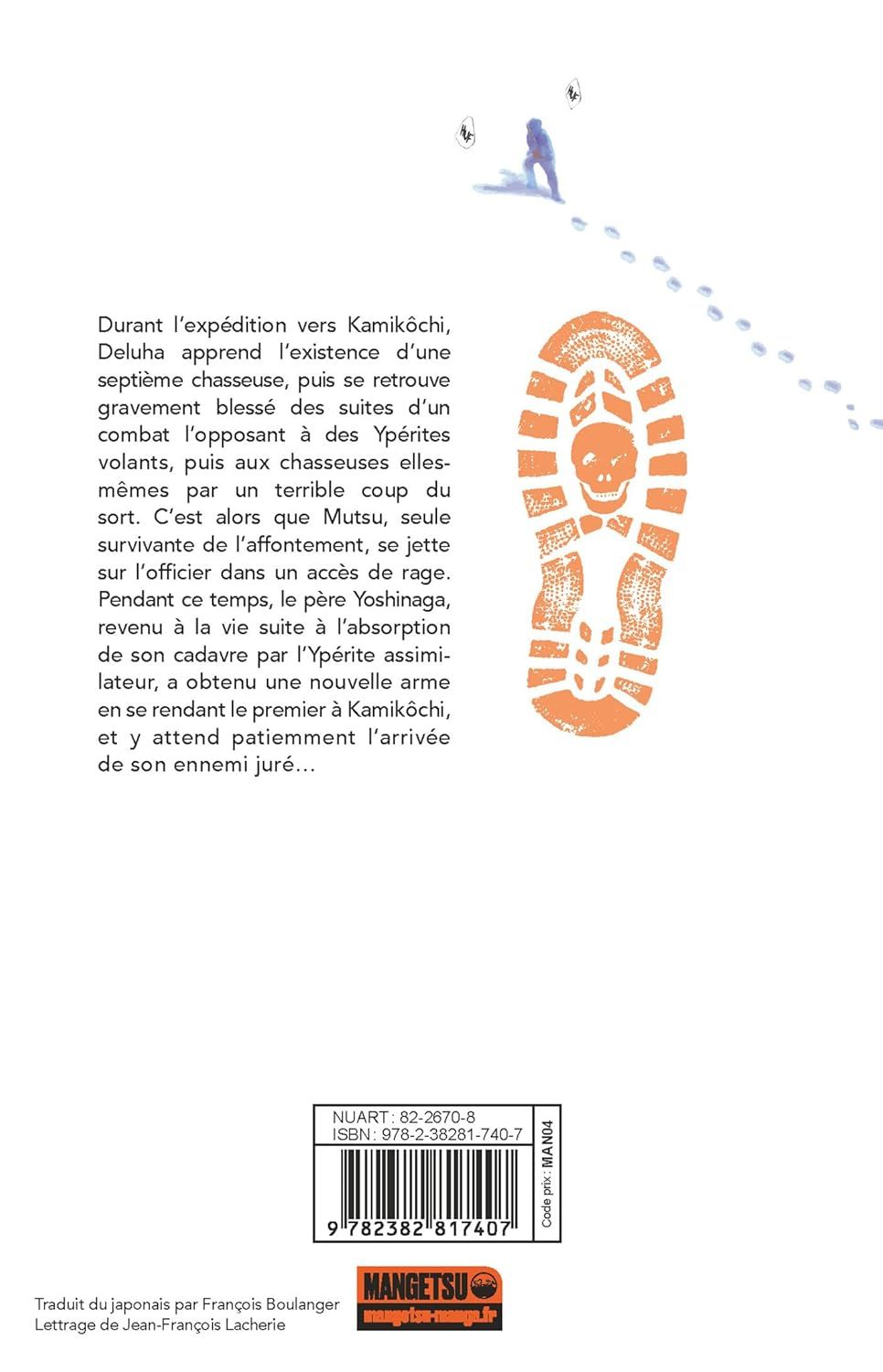 Durant l’expédition vers Kamikôchi, Deluha apprend l’existence d’une septième chasseuse, puis se retrouve gravement blessé des suites d’un combat l’opposant à des Ypérites volants, puis aux chasseuses elles-mêmes par un terrible coup du sort. C’est alors que Mutsu, seule survivante de l’affrontement, se jette sur l’officier dans un accès de rage. Pendant ce temps, le père Yoshinaga, revenu à la vie suite à l’absorption de son cadavre par l’Ypérite assimilateur, a obtenu une nouvelle arme en se rendant le premier à Kamikôchi, et y attend patiemment l’arrivée de son ennemi juré...