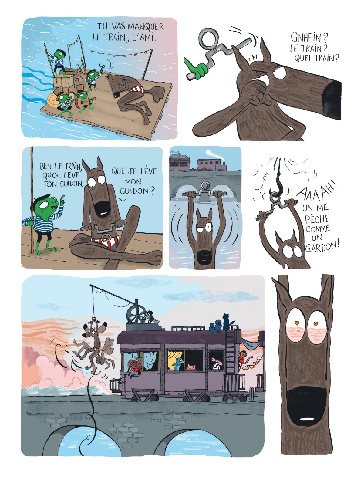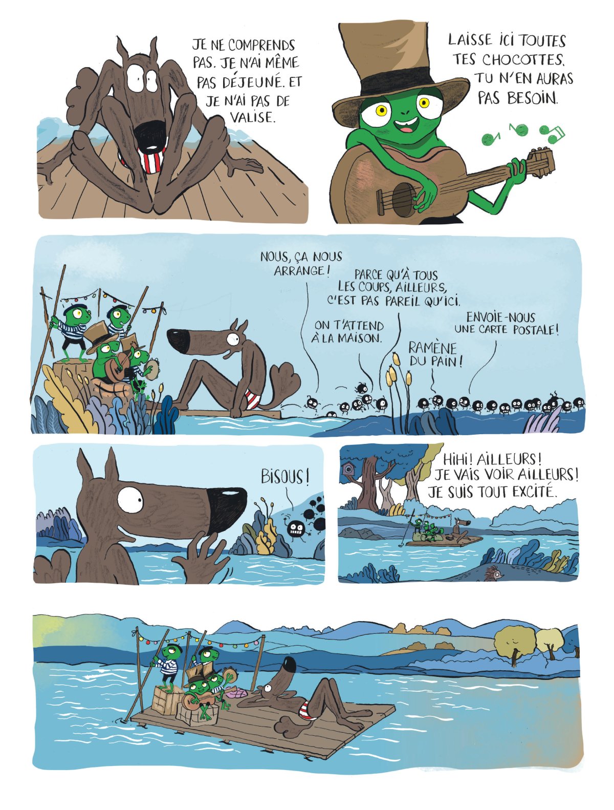 Pour la première fois de sa vie, le Loup en slip quitte le giron douillet de sa forêt natale et découvre d’autres façons de vivre. Un drôle de train l’arrache à son train-train, il part pour le lointain ! Les pays inconnus, les gens pas comme lui ! C’est l’aventure
