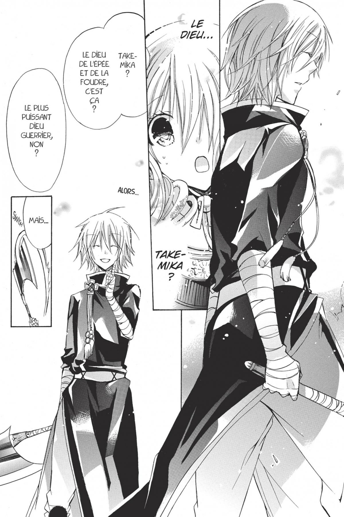 Mashiro vit désormais dans un sanctuaire avec Hayate et Hinokagu, le dieu du feu qui l’a aidée à s’enfuir de chez sa tante... Mais Midori Kamitsuka, le maître des lames, se lance à sa poursuite et l’attaque violemment, heureusement, un nouveau dieu surgit de la chevelure de la jeune fille, il s’agit de Takemika, le dieu de l’épée et de la foudre ! Il vole à son secours et sauve la jeune fille...