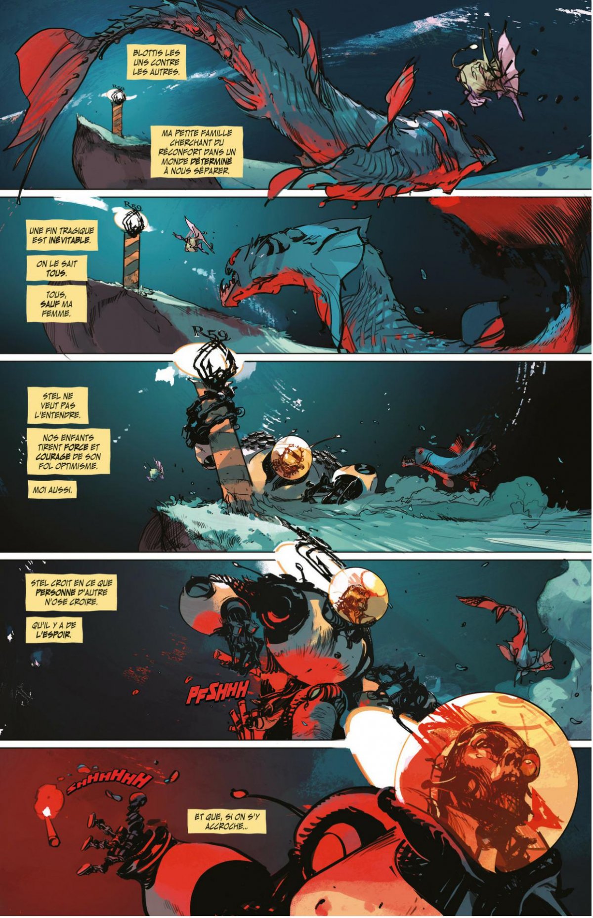 Le futur lointain. Accablée par les rayons destructeurs d’un soleil mourant, l’Humanité a été contrainte de se réfugier au coeur de vastes cités sous-marines alors qu’elle continue à envoyer des sondes spatiales en quête d’un nouveau foyer. Après plusieurs centaines d’années, une sonde s’écrase à la surface de la Terre, désormais peuplée d’une race extra-terrestre inconnue des humains. Stel, dernière scientifique déterminée à ne pas laisser l’Humanité s’éteindre au fond des océans, se met en quête de récupérer la précieuse sonde, emmenant dans son sillage Marik, son fils et unique survivant du massacre de leur famille, dix ans auparavant. Low Volume 1 : The Delirium of Hope (#1-6)