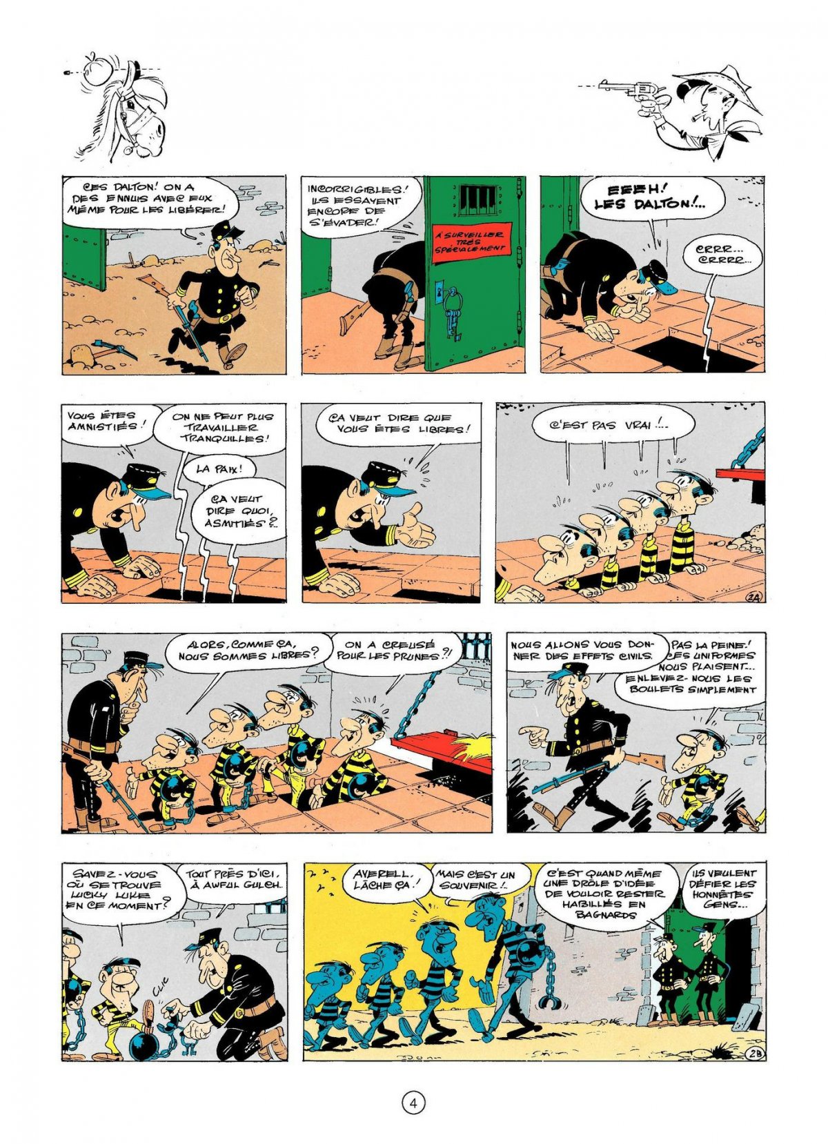 Le nouveau président des États-Unis décrète une amnistie générale. Tous les prisonniers sont libérés y compris les Dalton. Ceux-ci s’installent dans une ville proche, Awful Gulch, et louent un local à côté de la banque. Ainsi ils pourraient creuser un tunnel jusqu’à cet établissement et voler l’argent. Mais Lucky Luke s’empresse de déménager la banque et d’y installer à la place le bureau du shérif