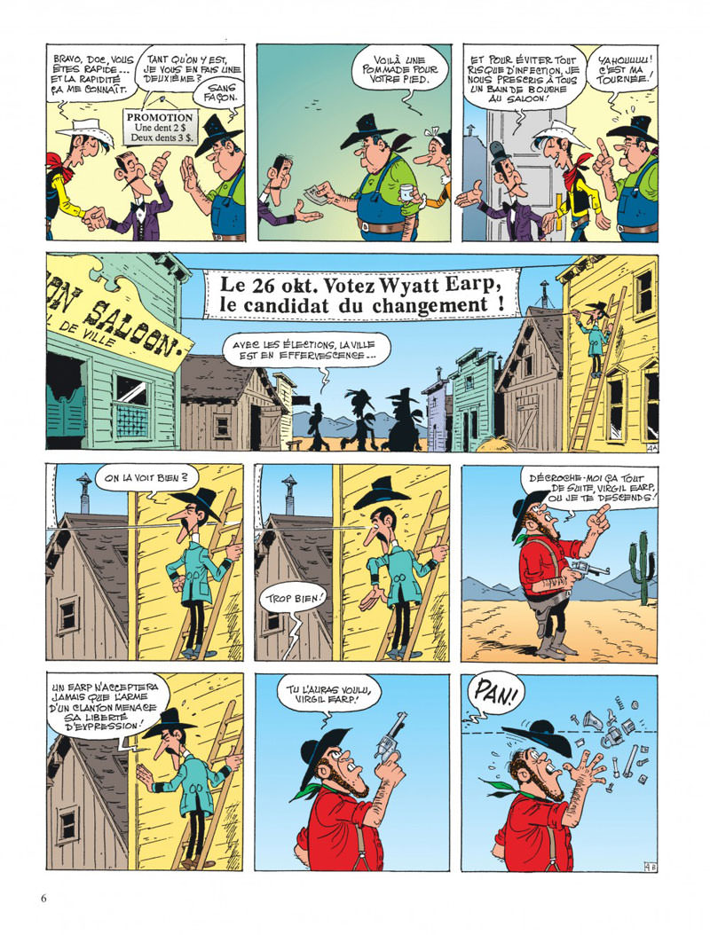 L’histoire : à Tombstone, petite ville de l’Ouest, la rivalité pour la candidature à la mairie entre « Old » Clanton et Wyatt Earp, le méchant maire et le sympathique challenger. Sur fond d’ambiance électorale fiévreuse, l’impartial Lucky Luke aidera a imposer un débat démocratique. Mais il se heurtera au plan machiavélique et à la violence des Clanton. Tout finira bien dans un ultime (et inévitable !) règlement de comptes