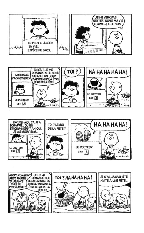 « The doctor is in ». L’ensemble des consultations de la plus pragmatique (et chipie) des psychiatres. Au début des années 1950, les « Peanuts » se moquaient de la psychanalyse. Pour le rôle capital du psychiatre au sein de la bande, Schulz choisit tout naturellement Lucy pour son caractère autoritaire et son pragmatisme. Elle n’a pas mis longtemps à découvrir la règle d’or de toute analyse : ne jamais oublier de se faire payer ! Elle soigne tout pour la modique somme de 5 « cents. »