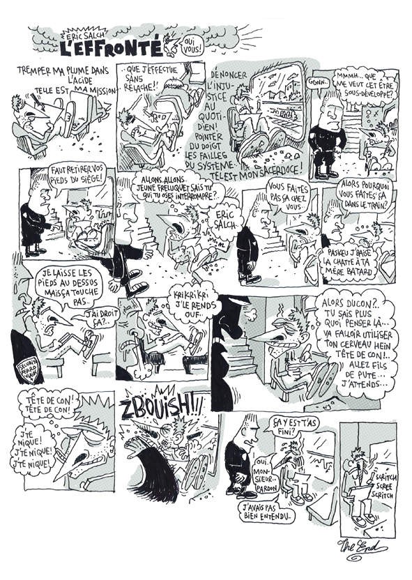 Prenez un chat psychopathe nommé Troufignon, une adorable peluche défoncée à la 8.6, une méthode de régime révolutionnaire, un joint qui parle, des birkenstoks avec des chaussettes blanches de sport, un éditeur érotomane en peignoir mauve, des collègues de travail dans leur intimité la plus sordide, des suppositoires en kimono, des angoisses existentielles... Secouez bien le tout, ajoutez une rondelle de citron pour la couleur et dégustez l’univers truculent, provocant et hilarant du cerveau de Eric Salch. Ne pas dépasser la dose prescrite.