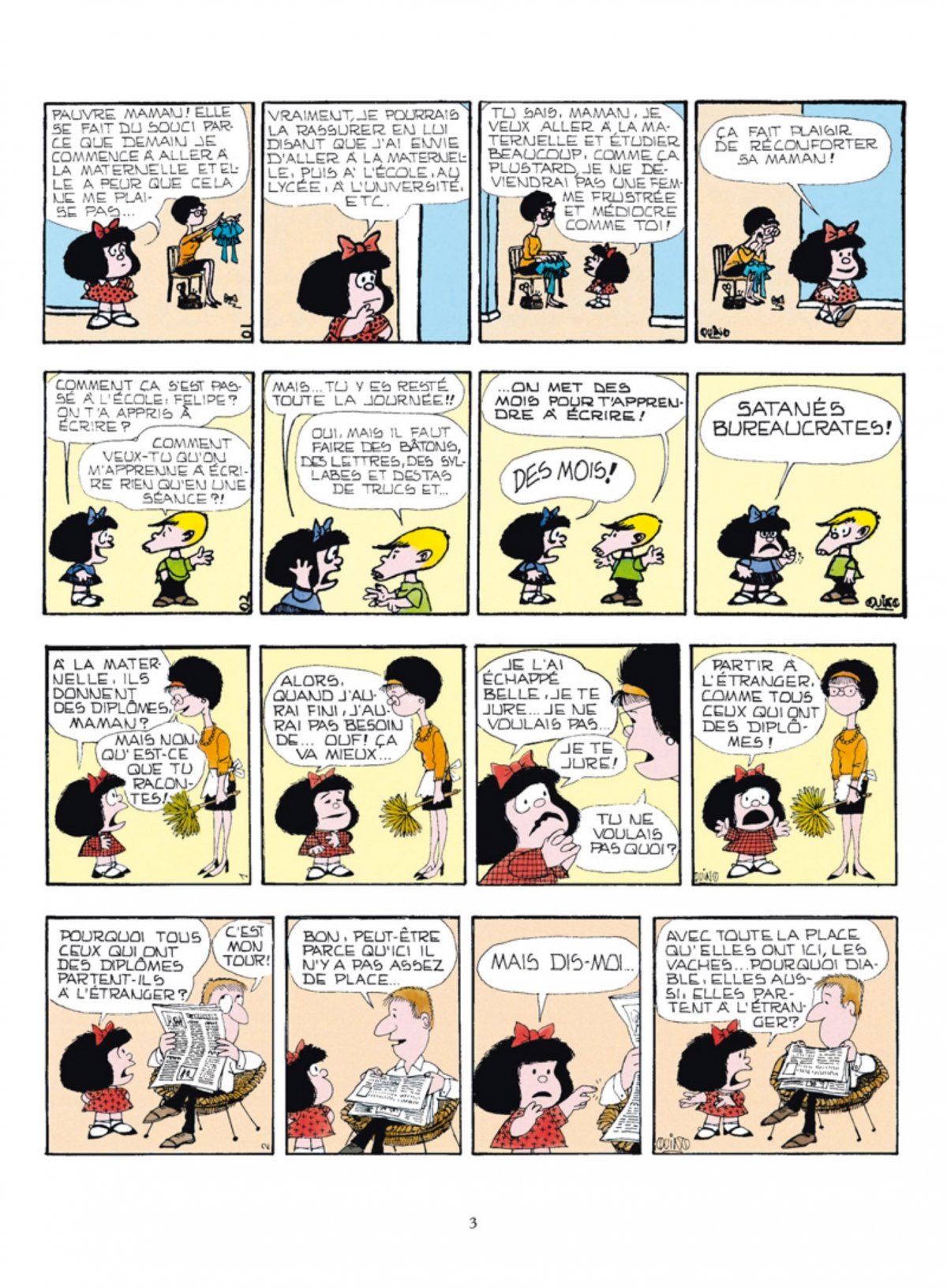 Mafalda, 46 ans, toutes ses dents et toujours aussi fraîche et impertinente ! On ne présente plus Mafalda, petite fille qui découvre la vie, ses joies, ses absurdités et ses horreurs. À travers l’éveil d’un enfant, Quino nous livre sa réflexion sur le monde et sur l’étrange animal qui le peuple : l’être humain. Quino donne naissance à Mafalda en 1964, personnage contestataire et anticonformiste de 10 ans, qui fera de lui un dessinateur mondialement reconnu.Les éditions Glénat sont fières de vous présenter la réédition complète de cette série emblématique à travers une nouvelle maquette sans aucun doute attrayante pour toutes les générations ! Petit bonus pour les inconditionnels, bibliophiles ou collectionneurs : une fois la série complète rééditée (janvier 2012), les tranches de tous les tomes rassemblés composeront un dessin décoiffant !