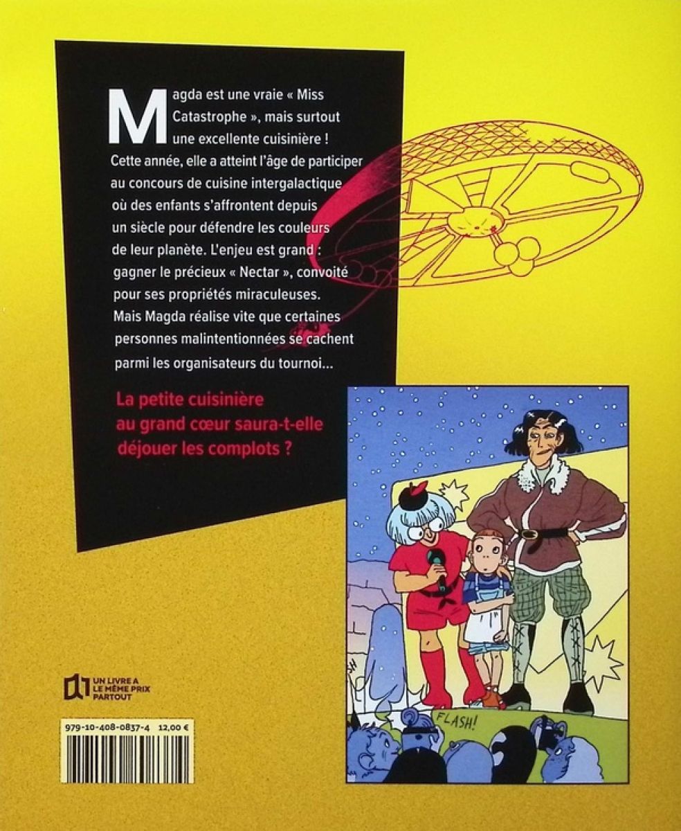 Magda, 12 ans, est née sur Azuki, une lune minuscule à la biodiversité exceptionnelle, peuplée de créatures légendaires. " Miss Catastrophe " en puissance et excellente cuisinière malgré elle, elle a le don pour inventer accidentellement des recettes uniques et exquises comme les soeurs Tatin avant elle. Par un coup de génie (ou du hasard...), elle est ainsi sélectionnée pour participer au fameux concours de cuisine végétarien intergalactique au cours duquel des enfants représentant chacun une planète s’affrontent depuis cent ans. L’enjeu est grand : gagner le " Nectar ", convoité par tous pour ses propriétés miraculeuses. Mais, alors que le tournoi bat son plein, Magda découvre que les dirigeants de certaines planètes se réunissent avec de sombres desseins : voler le Nectar et s’en servir pour étendre leur pouvoir sur toute la galaxie. À l’aide de Mamidou sa grand-mère ancienne championne intergalactique et de ses amis la petite cuisinière au grand coeur saura-t-elle déjouer les intrigues politiques et retrouver l’esprit de paix et de partage du tournoi ?