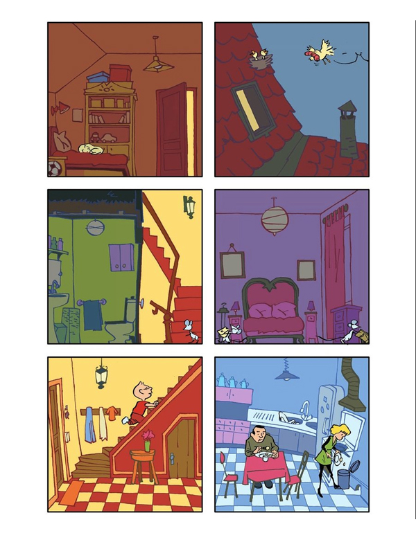 Dans chaque planche de la bande dessinée, le lecteur visualise les 6 pièces de vie et les actions des différents personnages. Il voit tout, il sait tout ! La mise en couleur, entre teintes lumineuses et teintes plus sombres, met en valeur les multiples péripéties et gags de l’histoire.