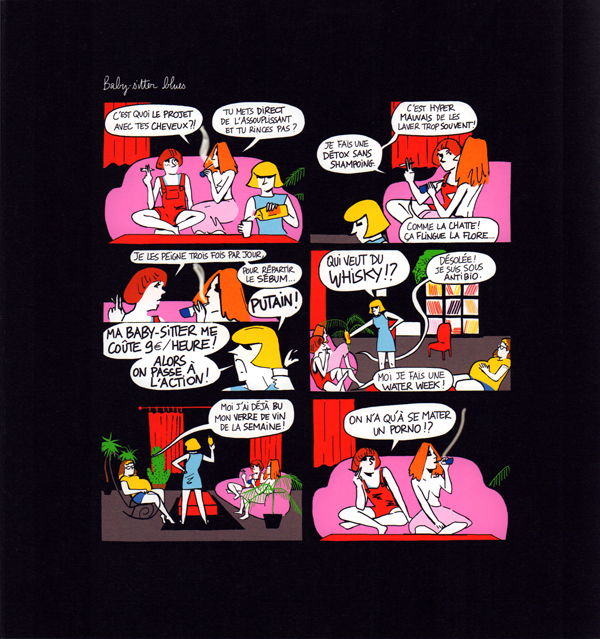 Nom d’une coupe menstruelle ! Par la Sainte Chlamydia ! C’est quoi ce bordel ? Depuis quand une autrice de bande dessinée peut montrer des meufs poils des jambes à l’air et seins apparents qui parlent de sodomie, comparent leurs godes et se moquent du yoga ? Toujours dans l’air du temps, et intéressée par la chose, Nine Antico nous brosse le portrait en huis-clos d’une bande de gonzesses sérieusement décomplexées, et nous agite sous le nez la vraie nature des filles, qui pour de vrai pètent, se droguent, parlent librement de leur corps et en rigolent. Le trait d’habitude vintage de Nine Antico se modernise dans Maléfiques de couleurs trash à l’image de ses heroïnes, résolument anti girly.