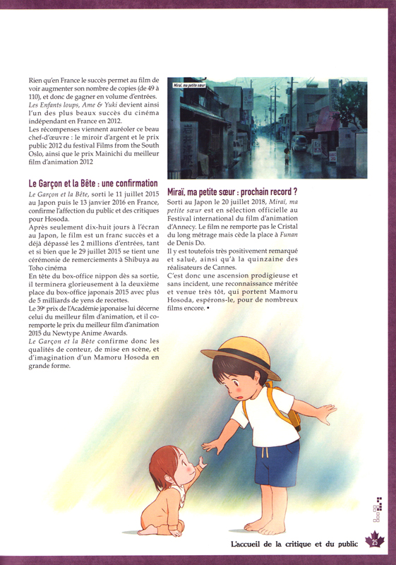 Ce mook rédigé par une équipe de passionnés et d’experts, en partenariat avec le magazine AnimeLand, veut également en faire l’écho à sa manière : en revenant sur les premiers pas de Hosoda dans l’animation, en mettant en lumière ses frères d’armes les plus notables, en décryptant son style et ses obsessions, et en détaillant de manière pointue ce qui fait l’essence de ses films. Pour finir, une galerie d’illustrations réalisées spécialement pour l’occasion par des artistes de divers horizons achève de célébrer l’œuvre du réalisateur en images.