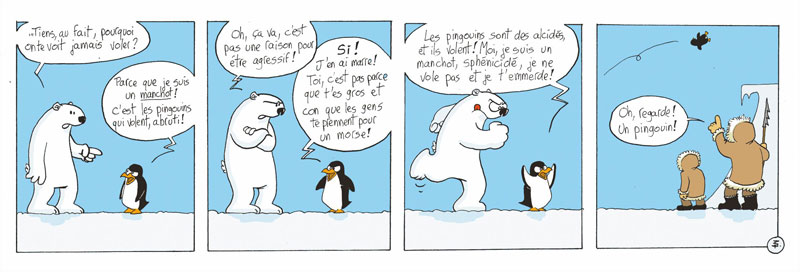 Ne confondez pas le manchot et le pingouin ! Le pingouin vole et vit en Arctique. Le manchot ne vole pas et vit en Antarctique. Celui-ci est un manchot et vit en Arctique, mais c’est un exemplaire unique... heureusement.