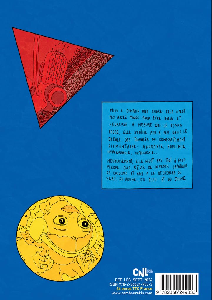 Miss a compris une chose : elle n’est pas pas assez mince pour être jolie et heureuse. À mesure que le temps passe, elle s’abîme peu à peu dans le dédale des troubles du comportement alimentaire : anorexie, boulimie, hyperphagie, orthorexie... Heureusement, elle n’est pas tout à fait perdue : elle rêve de devenir créatrice de couleurs et part à la recherche du vert, du rouge, du bleu et du jaune.