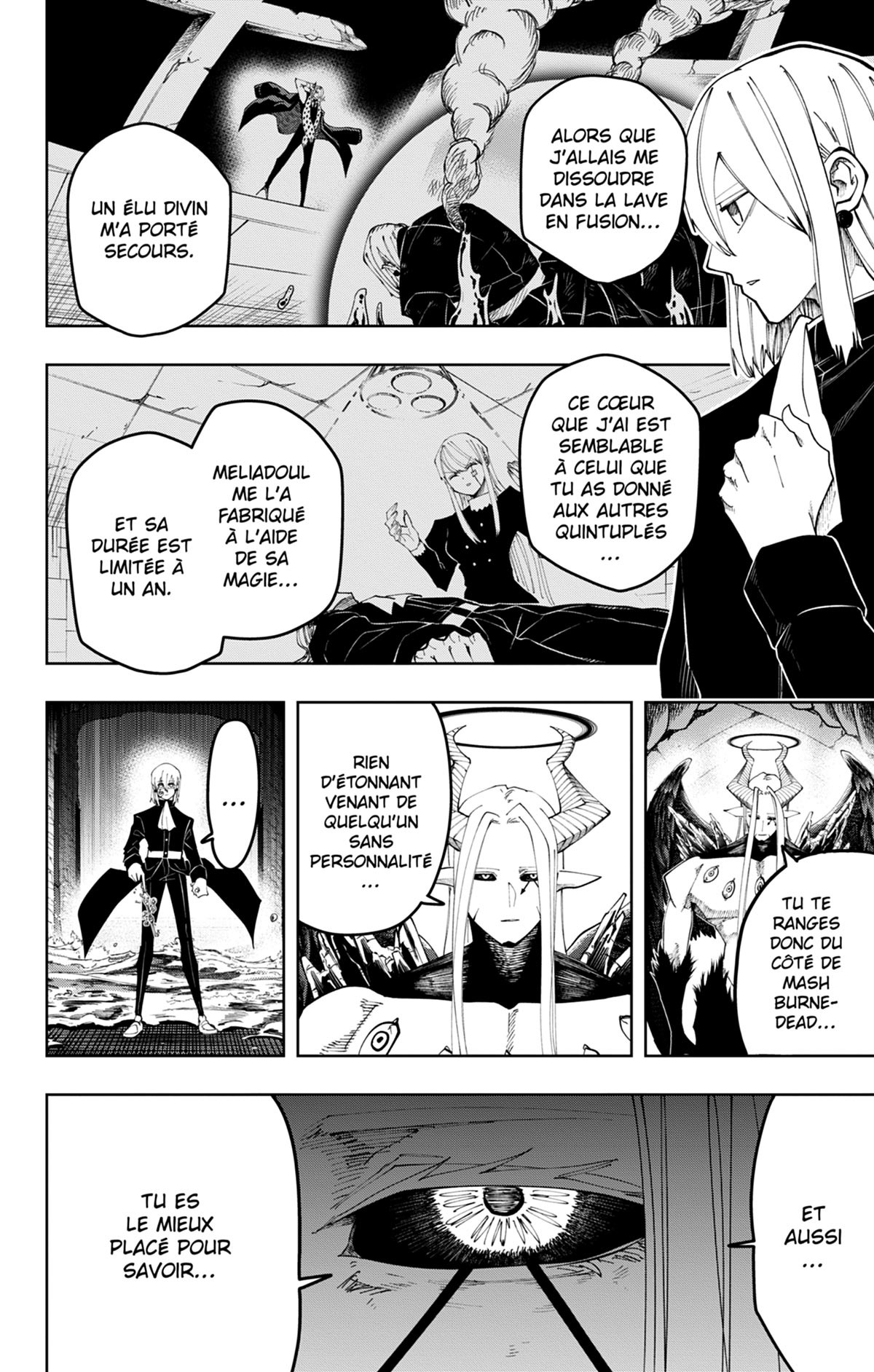 Innocent Zero poursuit Mash après lui avoir arraché le coeur, mais est arrêté dans son élan par Domina. Ce dernier, qui avait sombré dans de la lave en fusion, resurgit pour barrer le passage à son redoutable père, au nom de l’amitié qui le lie à son ancien adversaire ! Pendant ce temps, les camarades de Mash, prêts à défier la mort, se démènent pour l’emmener auprès de Meliadoul. Réussiront-ils à atteindre leur destination malgré leurs blessures et les ennemis lancés à leurs trousses ? De son côté, Mash se retrouve à errer dans les limbes, où il fait une rencontre des plus incongrues...
