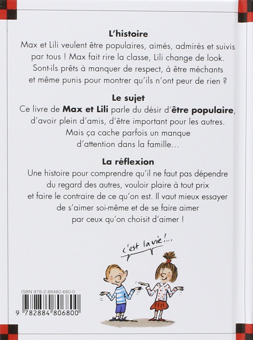 Max et Lili veulent être admirés par tout le monde. Jusqu’où iront-ils pour plaire à tout prix ? Ce livre parle du désir d’être populaire et montre qu’il ne faut pas toujours tenir compte du regard des autres. L’important, c’est de rester soi-même !