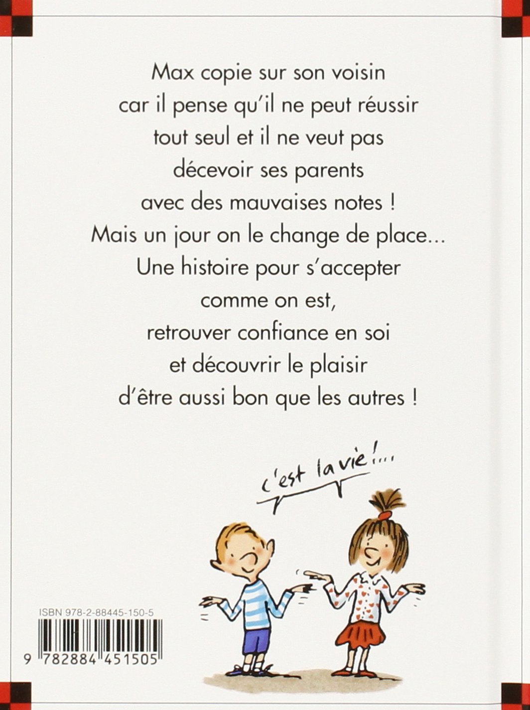Max copie sur son voisin : il pense qu’il ne peut pas réussir tout seul et a peur de décevoir ses parents. Ce livre parle de la tricherie à l’école et permet de retrouver confiance en soi en découvrant le plaisir de compter sur ses propres capacités.