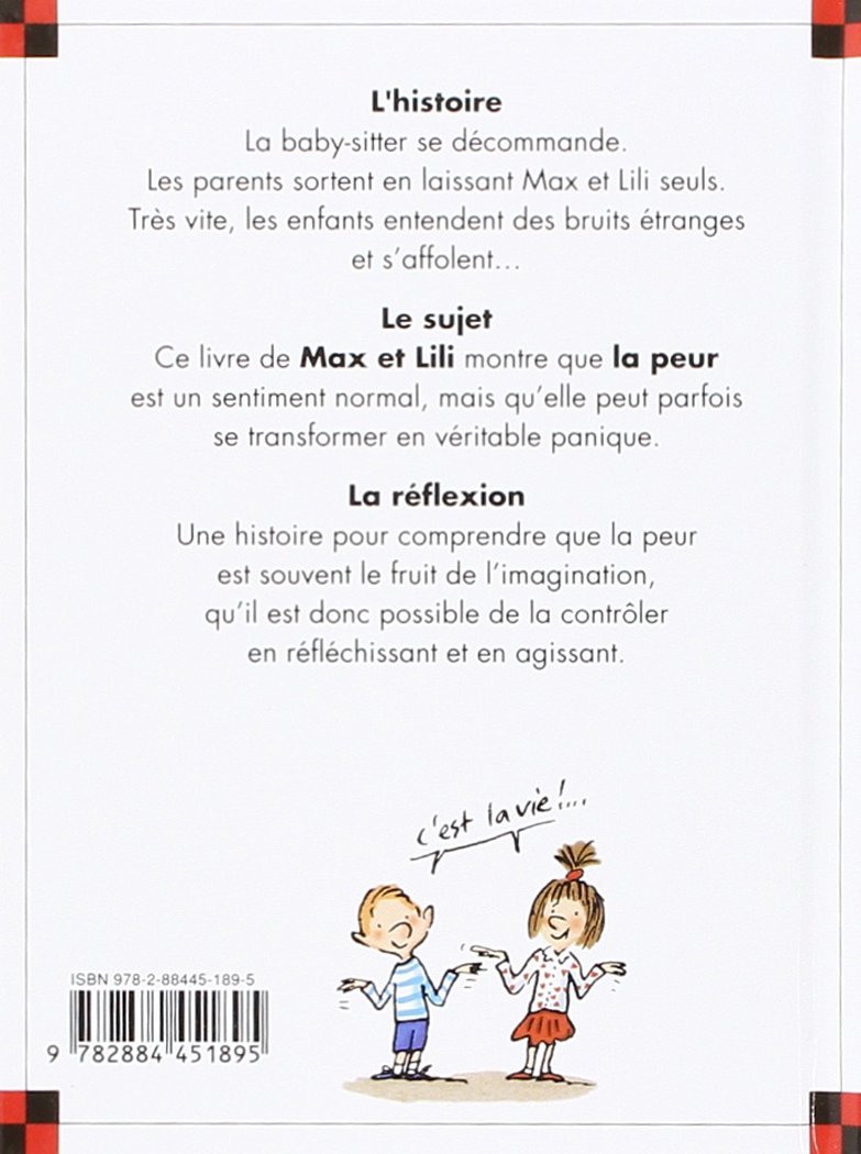 La baby-sitter se décommande. Les parents sortent en laissant Max et Lili seuls. Très vite, les enfants entendent des bruits et s’affolent... Ce livre montre que la peur est un sentiment normal et qu’elle est souvent le fruit de l’imagination.