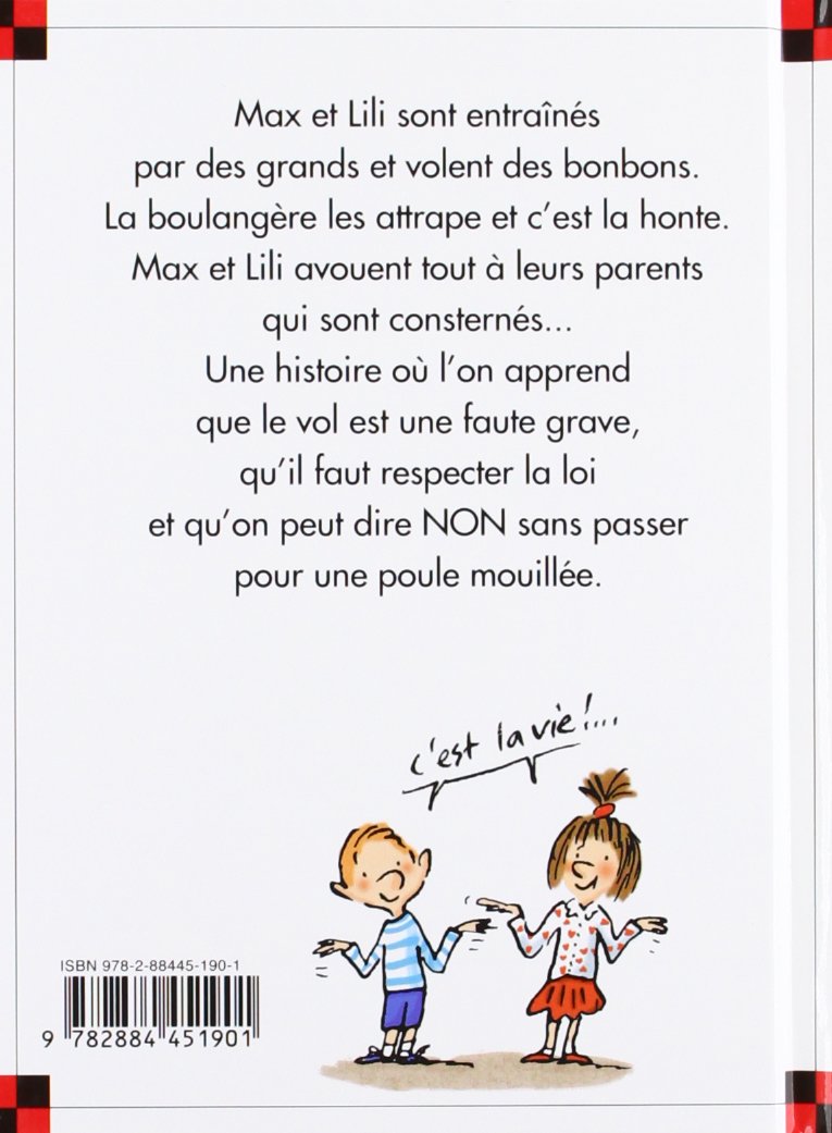 Entraînés par des grands, Max et Lili volent des bonbons. Mais la boulangère les attrape. Les enfants avouent tout à leurs parents... Ce livre montre que le vol est une faute grave et qu’on peut dire non sans passer pour une poule mouillée.