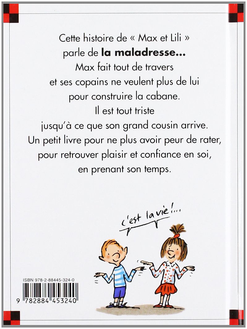Max fait tout de travers. À cause de sa maladresse, ses copains ne veulent plus de lui pour construire la cabane. Il est tout triste, jusqu’à ce que son grand cousin arrive... Un livre pour ne plus avoir peur de l’échec et retrouver confiance en soi.
