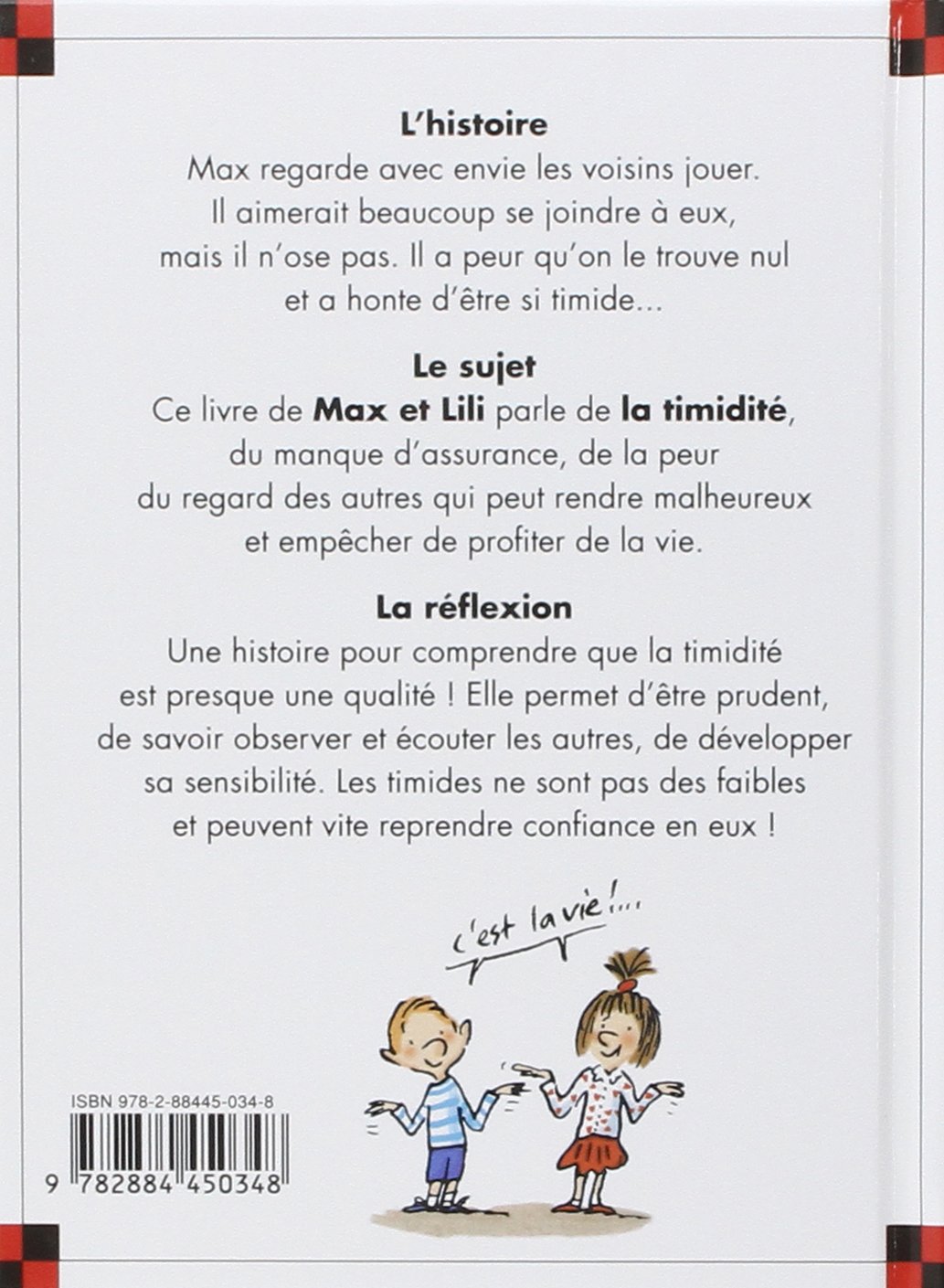 Max aimerait jouer avec les voisins, mais il a peur qu’on le trouve nul... Ce livre parle de la timidité qui rend parfois malheureux, mais peut aussi être une qualité. Les timides ne sont pas des faibles et peuvent vite reprendre confiance en eux !