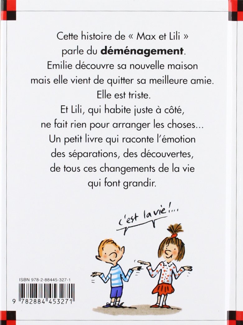 Émilie découvre sa nouvelle maison, mais elle vient de quitter avec tristesse sa meilleure amie. Lili, sa nouvelle voisine, ne fait rien pour arranger les choses... Un livre qui parle des déménagements et des changements de la vie qui font grandir.
