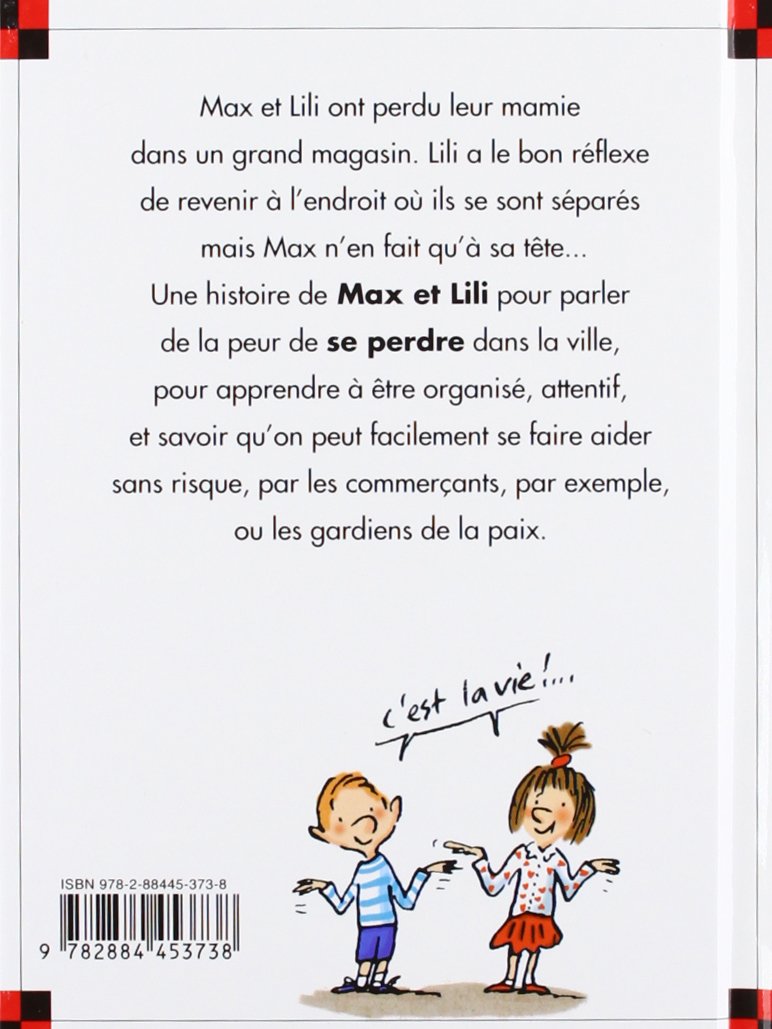Max et Lili ont perdu leur mamie dans un grand magasin. Lili se montre sérieuse et organisée, mais Max n’en fait qu’à sa tête... Une histoire pour parler de la peur de se perdre dans la ville et pour apprendre comment se faire aider sans risques.