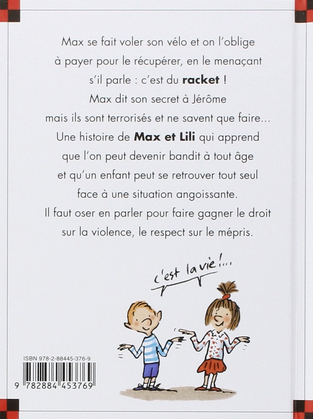 Max se fait voler son vélo. On l’oblige à payer pour le récupérer et on le menace de représailles s’il en parle. Max révèle son secret à Jérôme, mais ils sont terrorisés... Une histoire qui parle du racket et montre qu’il faut refuser cette violence.