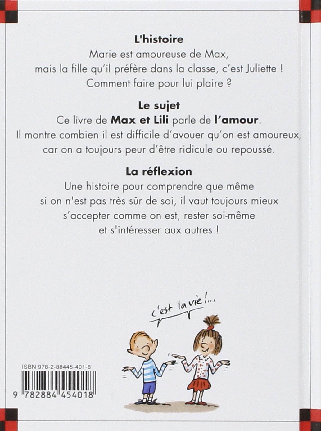 Dans la classe, la fille que Max préfère, c’est Juliette... Mais comment lui plaire ? Ce livre montre qu’il est difficile de dire qu’on est amoureux, car on a toujours peur d’être ridicule ou repoussé. Il apprend qu’il vaut mieux rester soi-même.