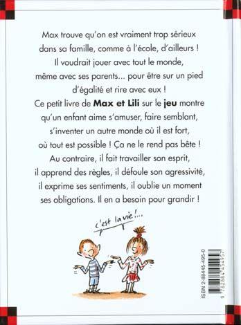 Max trouve qu’on est vraiment trop sérieux dans sa famille ! Il voudrait jouer avec tout le monde... Ce livre montre qu’un enfant a besoin de s’amuser pour grandir : grâce au jeu, il développe son imagination, se dépense et exprime ses sentiments.