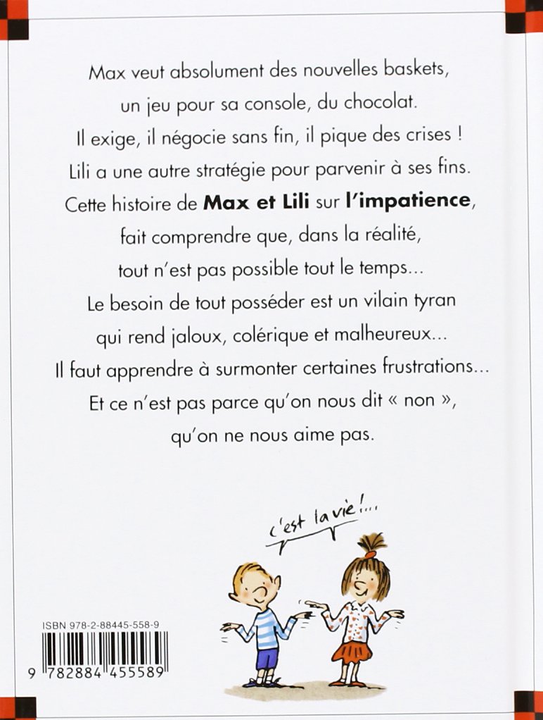 Max veut des baskets, un jeu vidéo... Il négocie sans fin et pique des crises ! Lili a une autre stratégie pour arriver à ses fins... Une histoire pour comprendre qu’on n’a pas toujours ce qu’on veut et que c’est bien de découvrir le plaisir d’attendre.