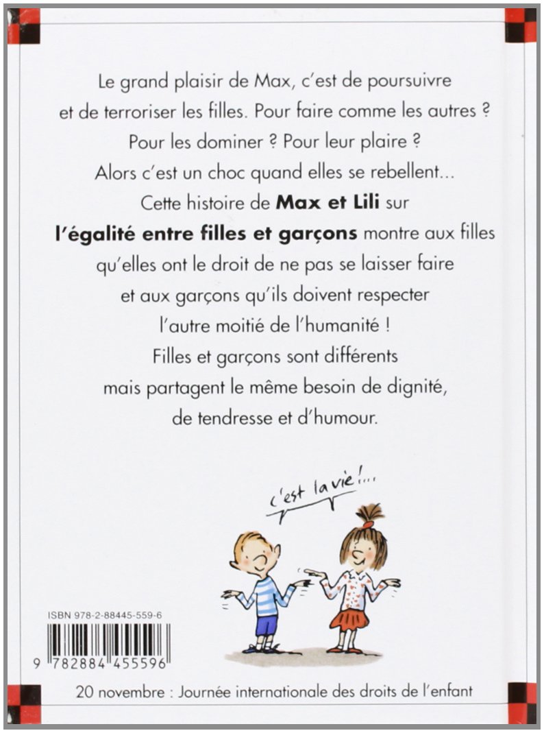Les filles décident de se rebeller contre Max, qui passe son temps à les embêter... Ce livre sur l’égalité entre filles et garçons montre que chacun a le droit de se défendre en cas de violence et le devoir de respecter l’autre moitié de l’humanité !