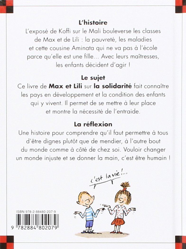 L’exposé de Koffi sur le Mali émeut les classes de Max et Lili : la pauvreté, la faim, sa cousine qui ne va pas à l’école... Ce livre sur la solidarité montre la condition des enfants dans les pays pauvres et invite à se mettre à la place des autres.