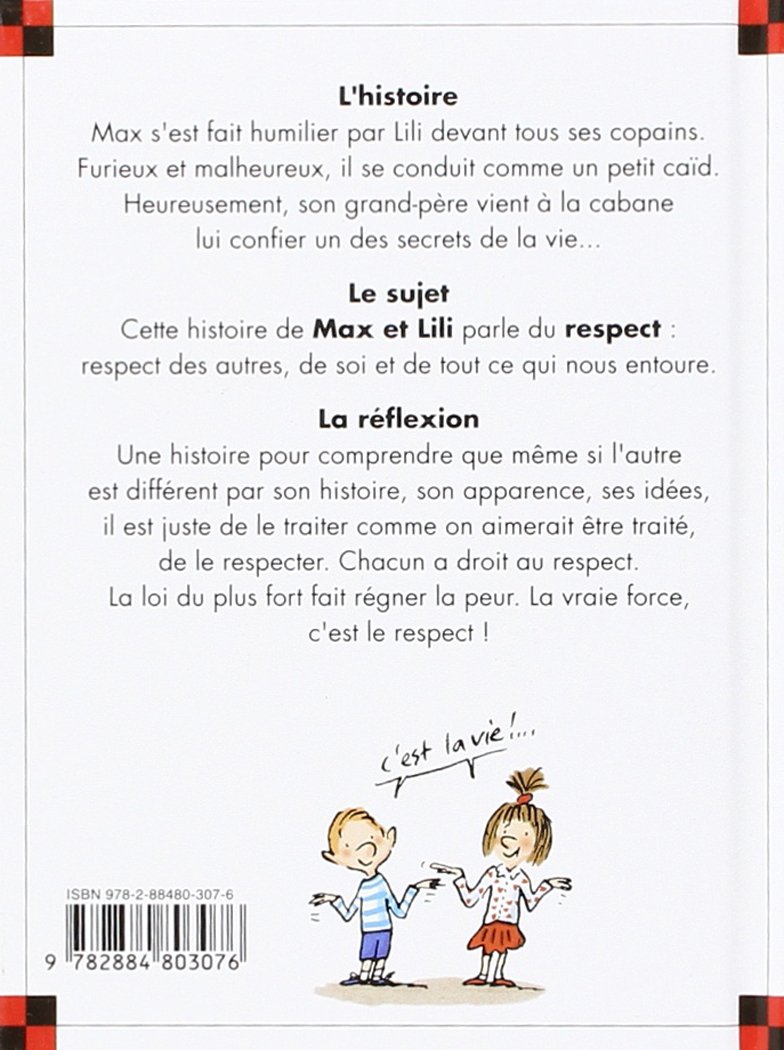 Max s’est fait humilier par Lili devant les copains. Furieux, malheureux, il se conduit comme un petit caïd, très mal... et se fait de moins en moins respecter. Heureusement, son grand-père vient à la cabane lui confier un des secrets de la vie... Cette histoire de Max et Lili parle du respect : respect des autres, de soi, de ce qui nous entoure. Même si l’autre est différent par son histoire, son apparence, ses idées, il a droit à une place, et il est juste de le traiter comme on aimerait être traité. Chacun doit respecter, chacun a droit au respect. La loi du plus fort fait régner la peur, la vraie force, c’est le respect !