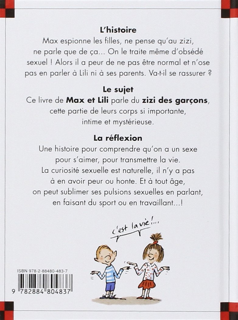 Max espionne les filles et ne pense qu’au zizi. On le traite d’obsédé sexuel ! Il a peur de ne pas être normal... Ce livre parle du zizi des garçons. Il apprend que la curiosité sexuelle est normale et qu’il n’y a pas à en avoir peur ou honte.