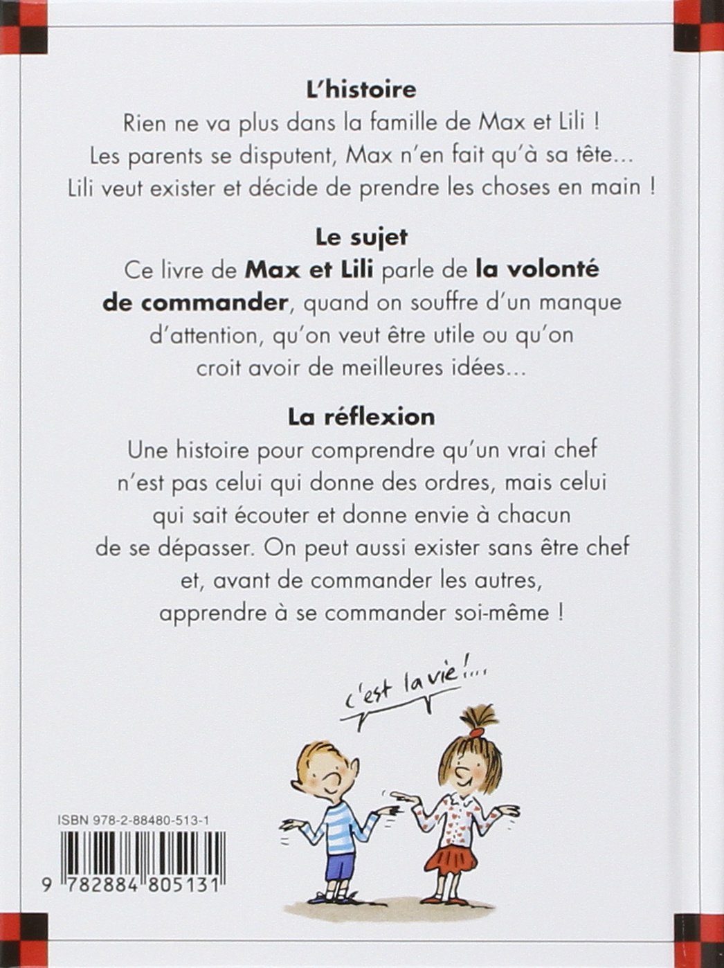 Les parents de Max et Lili se disputent, Max n’en fait qu’à sa tête. Lili décide d’agir ! Ce livre parle de l’autorité. Il montre qu’un vrai chef n’est pas celui qui donne des ordres, mais celui qui écoute et pousse chacun à se dépasser...