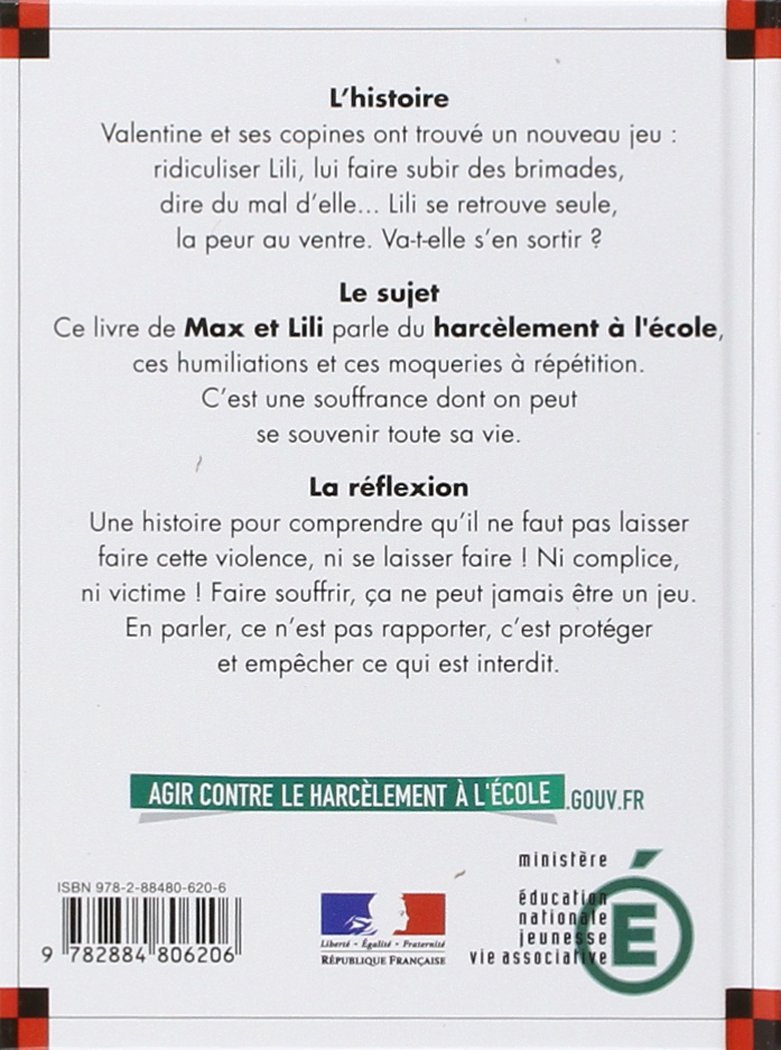 Valentine et ses copines ont trouvé un nouveau jeu : se moquer de Lili et l’humilier. Ce livre parle du harcèlement à l’école, de la violence des mots. Il montre qu’il faut en parler et ne pas se laisser faire. Faire souffrir, ce n’est pas un jeu !
