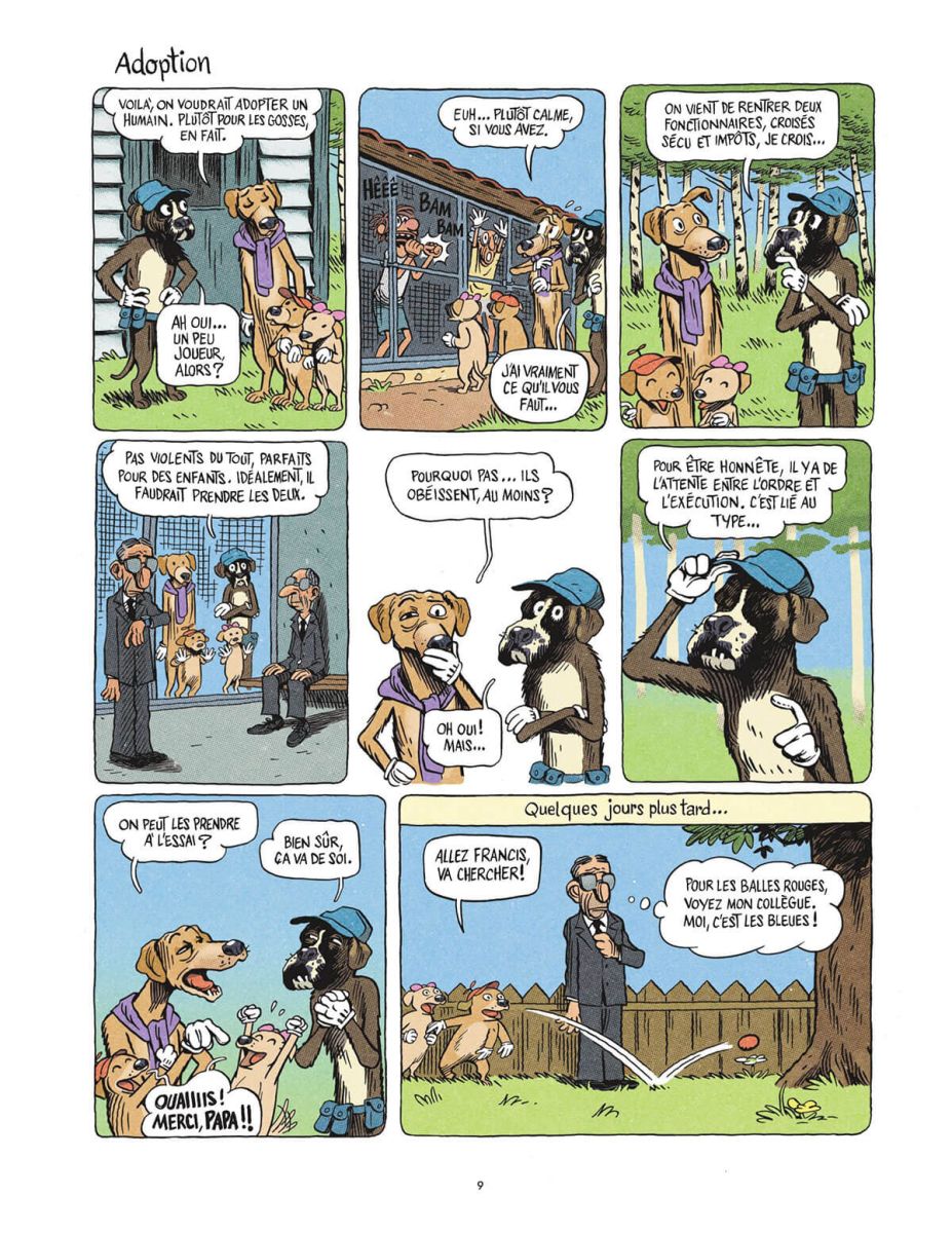 Un album sociétal où les chiens prennent la place des humains, et les humains finissent par adopter le comportement des chiens. Les hommes courent lentement à leur perte et le monde s’effondre, laissant les IA comme têtes dirigeantes. Et si les chiens décidaient de prendre le pouvoir ? Face à l’échec humain, les chiens décident de reprendre les rennes pour rétablir l’ordre et la paix. Mais si les quadrupèdes gagnent en responsabilité, les bipèdes quant à eux se voient relégués au rang d’animaux de compagnie. Tenus en laisse, forcés de se reproduire pour entretenir leur lignée, incapables de rester plus d’une heure seuls dans un appartement... Les humains occupent alors la place des chiens.