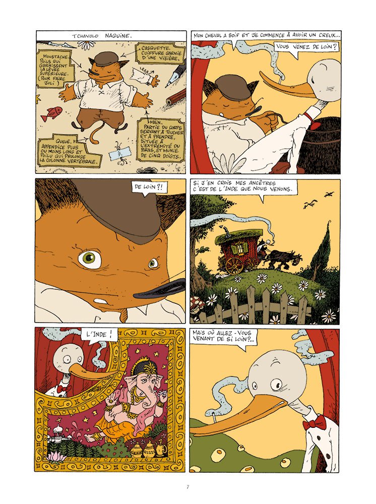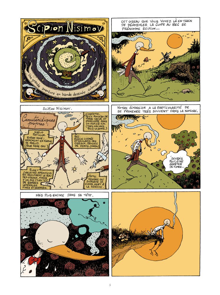 Scipion Nisimov, échassier au bec recourbé, est un personnage rêveur qui aime errer. Un jour, il croise Tchavolo, un Tzigane, avec qui il sympathise. Mais le soir-même, alors qu’il retrouve son domicile, il surprend sa fiancée Daphné au lit avec un taureau. Abattu, Scipion retrouve Tchavolo, dont les airs de guitare l’aident à oublier pour un temps son malheur.