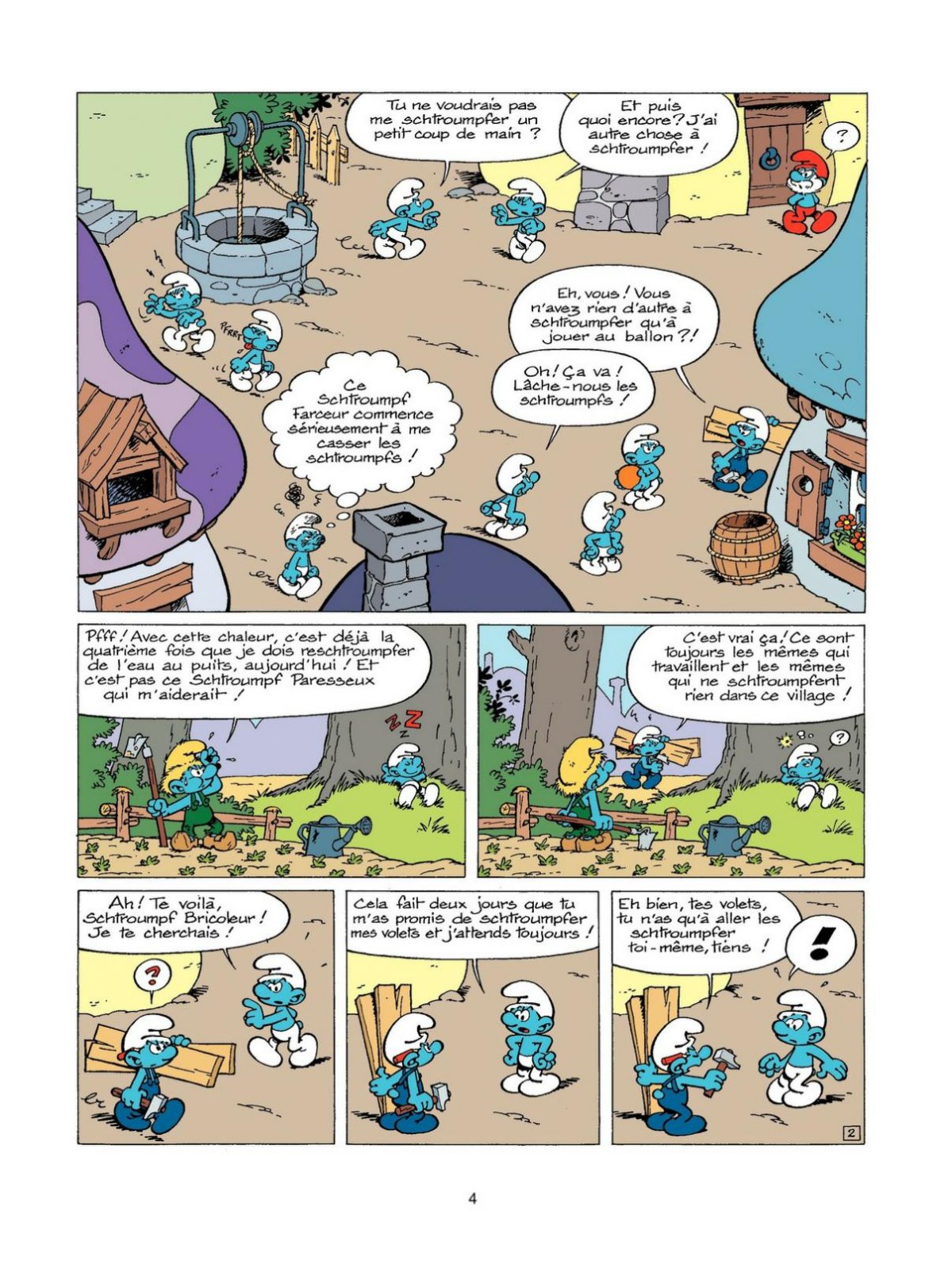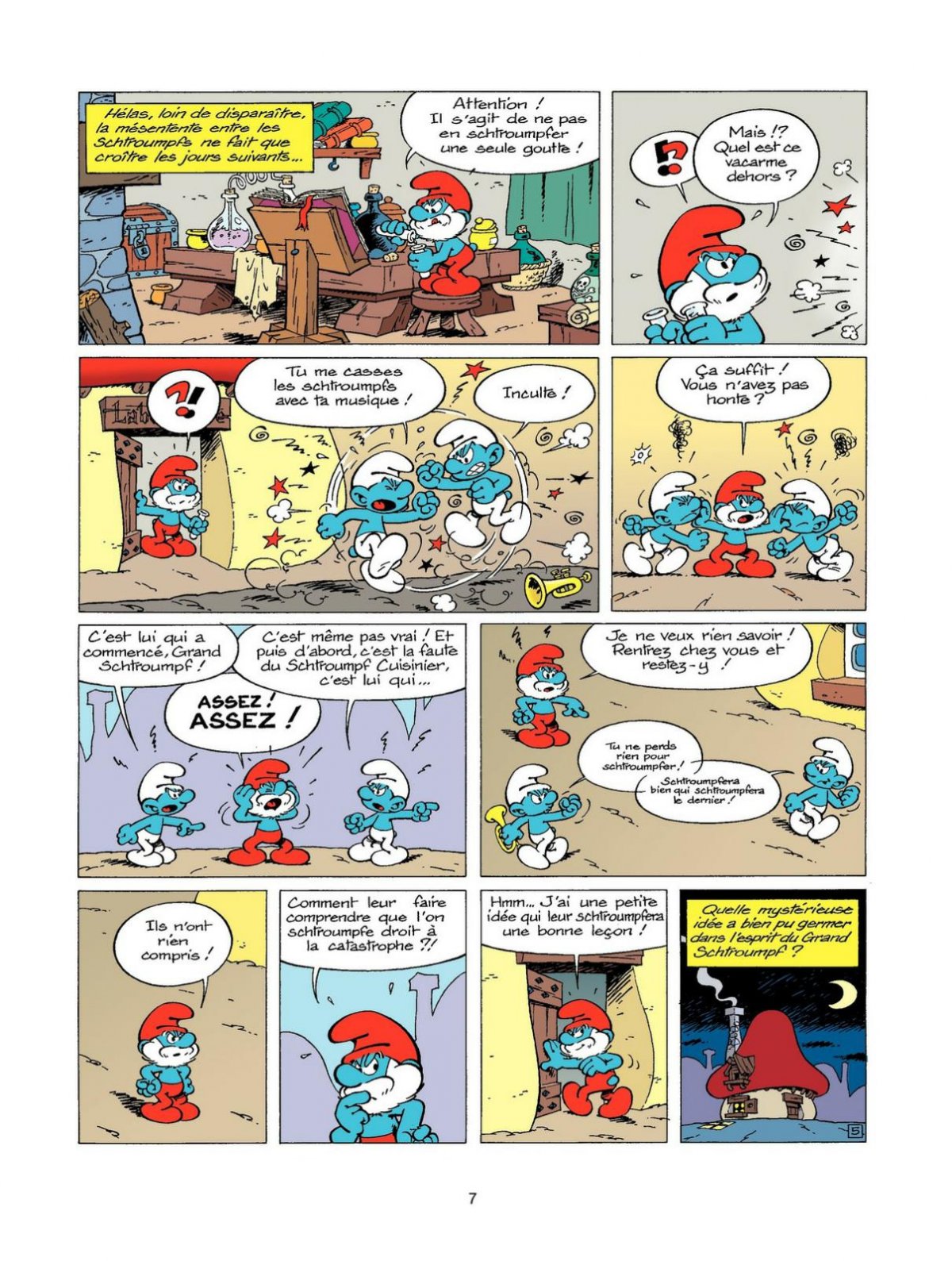 Rien ne va plus au village des Schtroumpfs ! Eux qui sont d’habitude si aimables, si gentils, si joyeux, les revoici méconnaissables. En effet, allez savoir pourquoi, depuis quelque temps, ils sont désagréables, grognons et querelleurs. Au fur et à mesure que les jours passent, la situation ne fait qu’empirer. Le Grand Schtroumpf est lui-même désemparé. Il faut toutefois absolument trouver un moyen de remettre les Schtroumpfs sur le droit chemin...