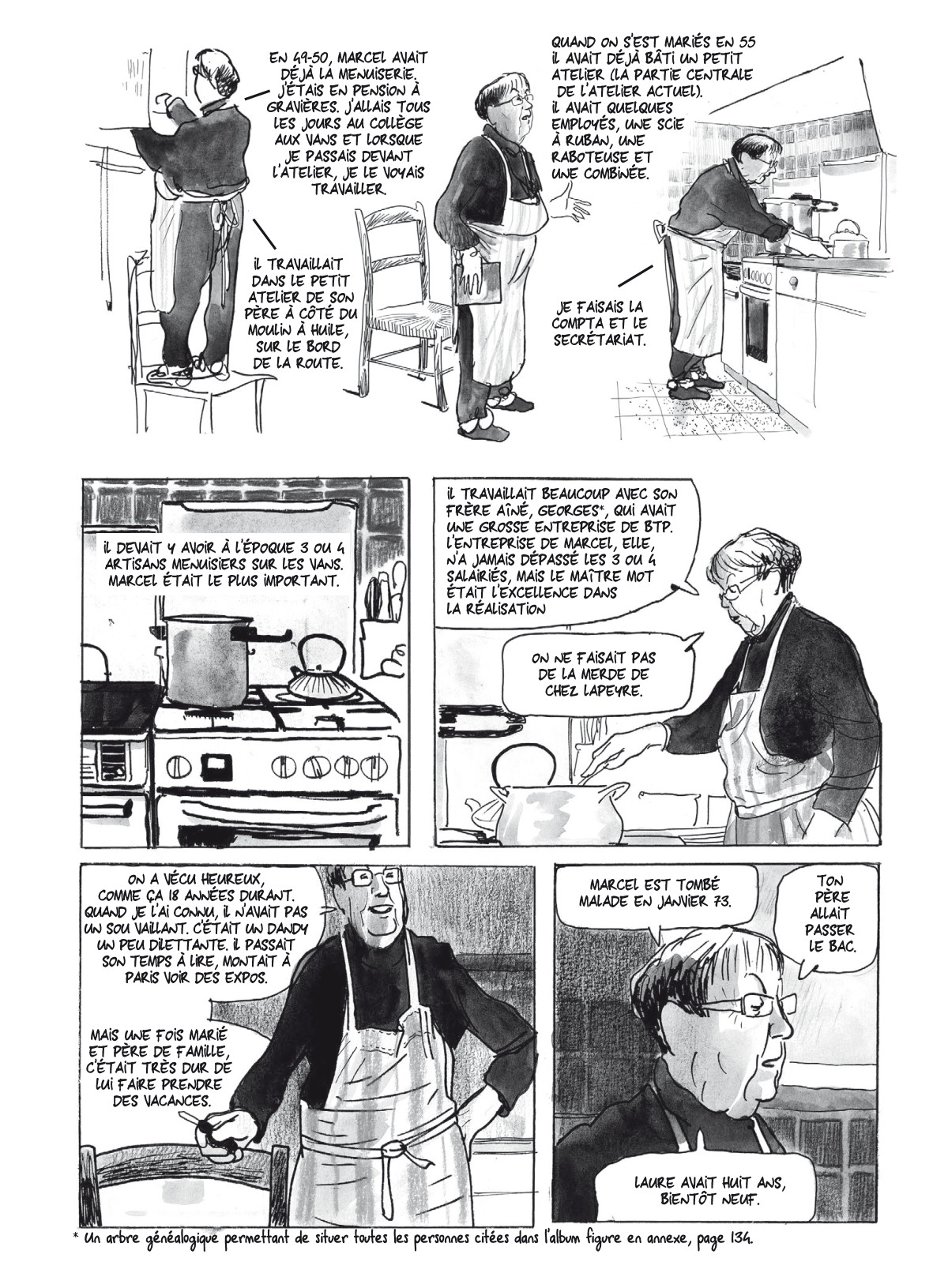 Aurel est retourné dans son village d’enfance et a suivi et interrogé son père, les ouvriers et les clients de la menuiserie, mais aussi sa grand-mère, qui continue de recevoir son fils toute les semaines à déjeuner, dont les menus agrémentent le livre et feront saliver le lecteur