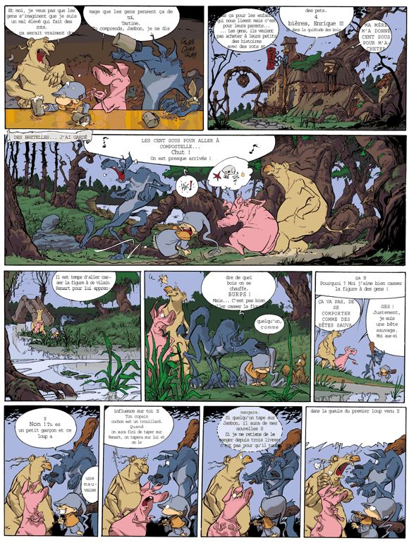 Nous sommes donc en plein Roman de Renart - la série originelle ayant été écrite aux XIIe et XIIIe siecles -, version Sfar et Munuera, c’est-a-dire iconoclaste. Avec quelques digressions rigolotes sur le déterminisme et la liberté de chacun (en particulier de l’auteur), l’incident du virtuel sur le destin des personnages, et le droit (ou non) de zigouiller ce salopard de Renart - un personnage du patrimoine, autant dire une légende. Sans oublier quelques détours par les Trois Petits Cochons et La Fontaine