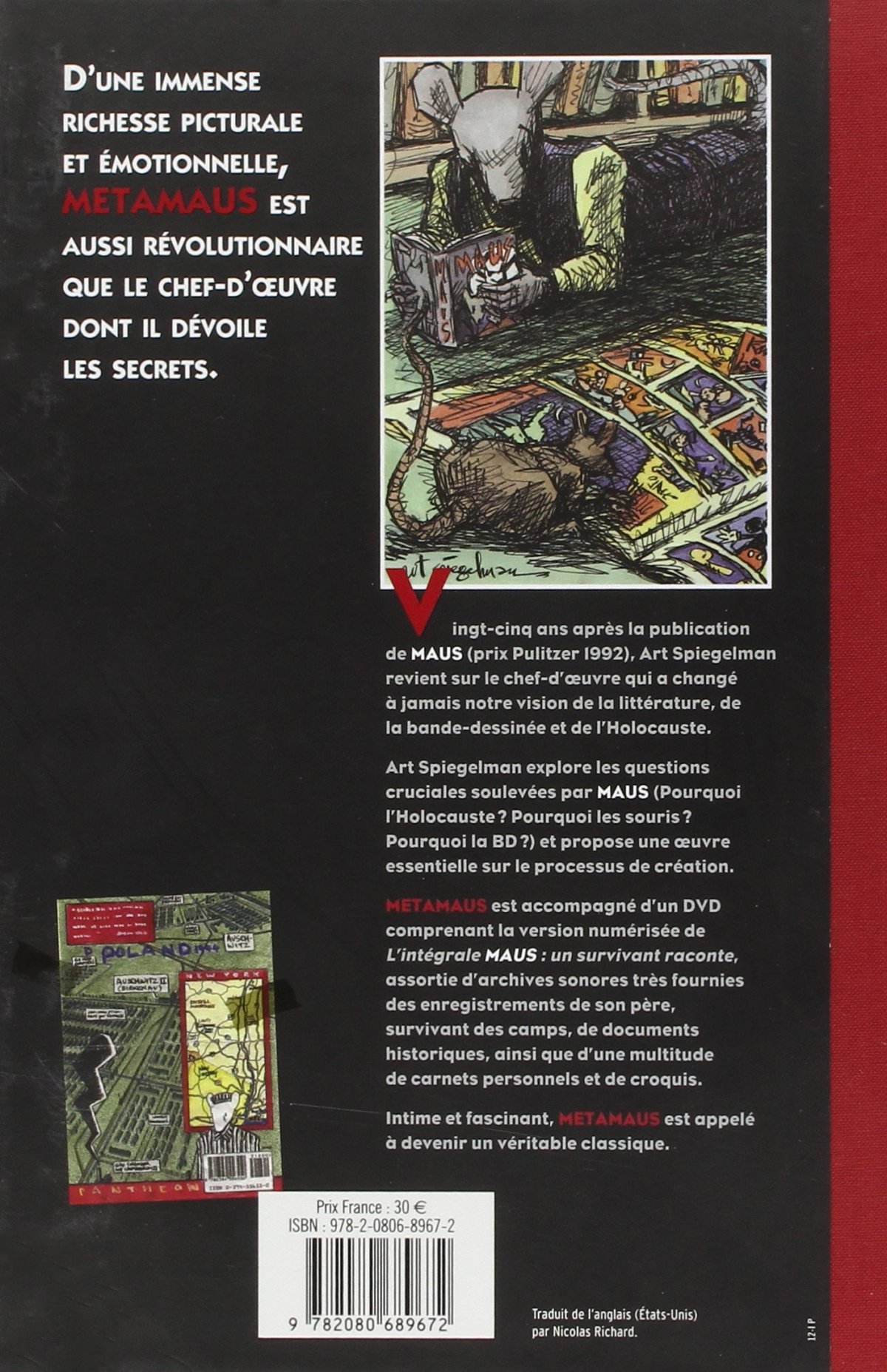 Vingt-cinq ans après la publication de MAUS (prix Pulitzer 1992), Art Spiegelman revient sur le chef-d’oeuvre qui a changé à jamais notre vision de la littérature, de la bande-dessinée et de l’Holocauste. Art Spiegelman explore les questions cruciales soulevées par MAUS (Pourquoi l’Holocauste ? Pourquoi les souris ? Pourquoi la BD ? ) et propose une oeuvre essentielle sur le processus de création. METAMAUS est accompagné d’un DVD comprenant la version numérisée de L’intégrale MAUS : un survivant raconte, assortie d’archives sonores très fournies des enregistrements de son père, survivant des camps, de documents historiques, ainsi que d’une multitude de carnets personnels et de croquis. Intime et fascinant, METAMAUS est appelé à devenir un véritable classique.
