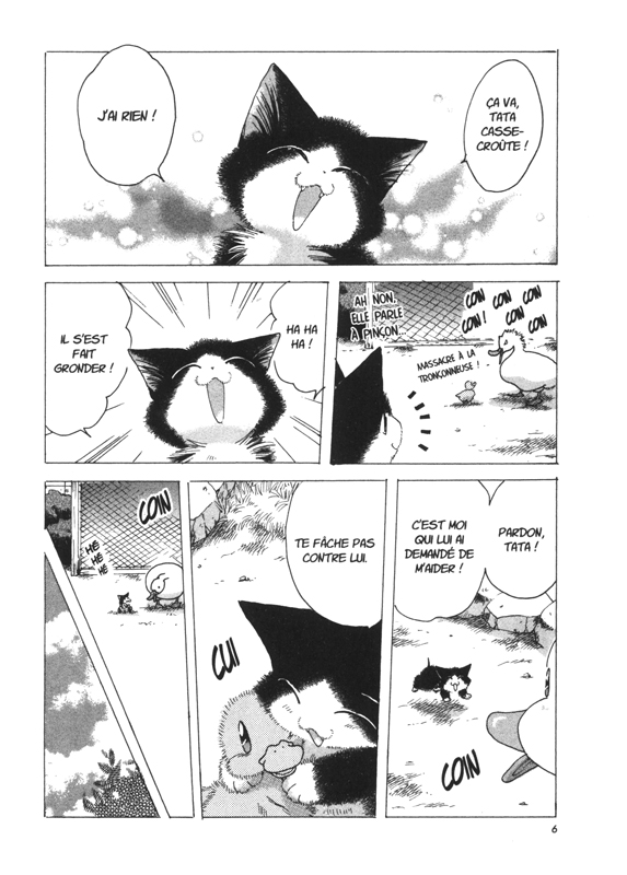 Depuis la naissance de Pinçon, le bébé de madame Casse-croûte, Moustic est devenu une vraie maman poule, ou plutôt, une maman-chat ! Le petit grandit et commence enfin à parler : il bredouille des mots compliqués entendus à la télévision, à la stupéfaction générale. Mais il est difficile d’élever un nouveau-né dans un environnement plein de dangers et de prédateurs, quand on est soi-même un enfant encore naïf et imprudent. Heureusement, Big-Boss le matou est toujours là pour protéger le chaton et le caneton. C’est encore un duo bien singulier qui va faire les quatre cents coups dans le quartier ! Une comédie irrésistible, un manga à adopter sans hésiter !