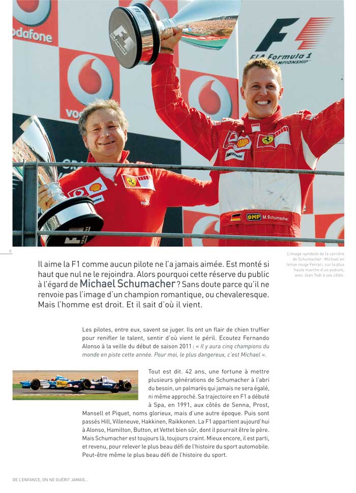 Ce nouveau Dossier Michel Vaillant célèbre la carrière et les victoires de Michael Schumacher. Avec ses sept titres de champion du monde et ses quatre-vingt onze victoires en Grand Prix, il détient la plupart des records de Formule 1. Figure incontournable du sport automobile, il fait l’objet d’une biographie illustrée illustré de dessins, d’images de presse et de photos personnelles. En bonus, 20 pages BD et la galerie dessinée de ses voitures emblématiques. Un inédit des Dossiers Michel Vaillant.