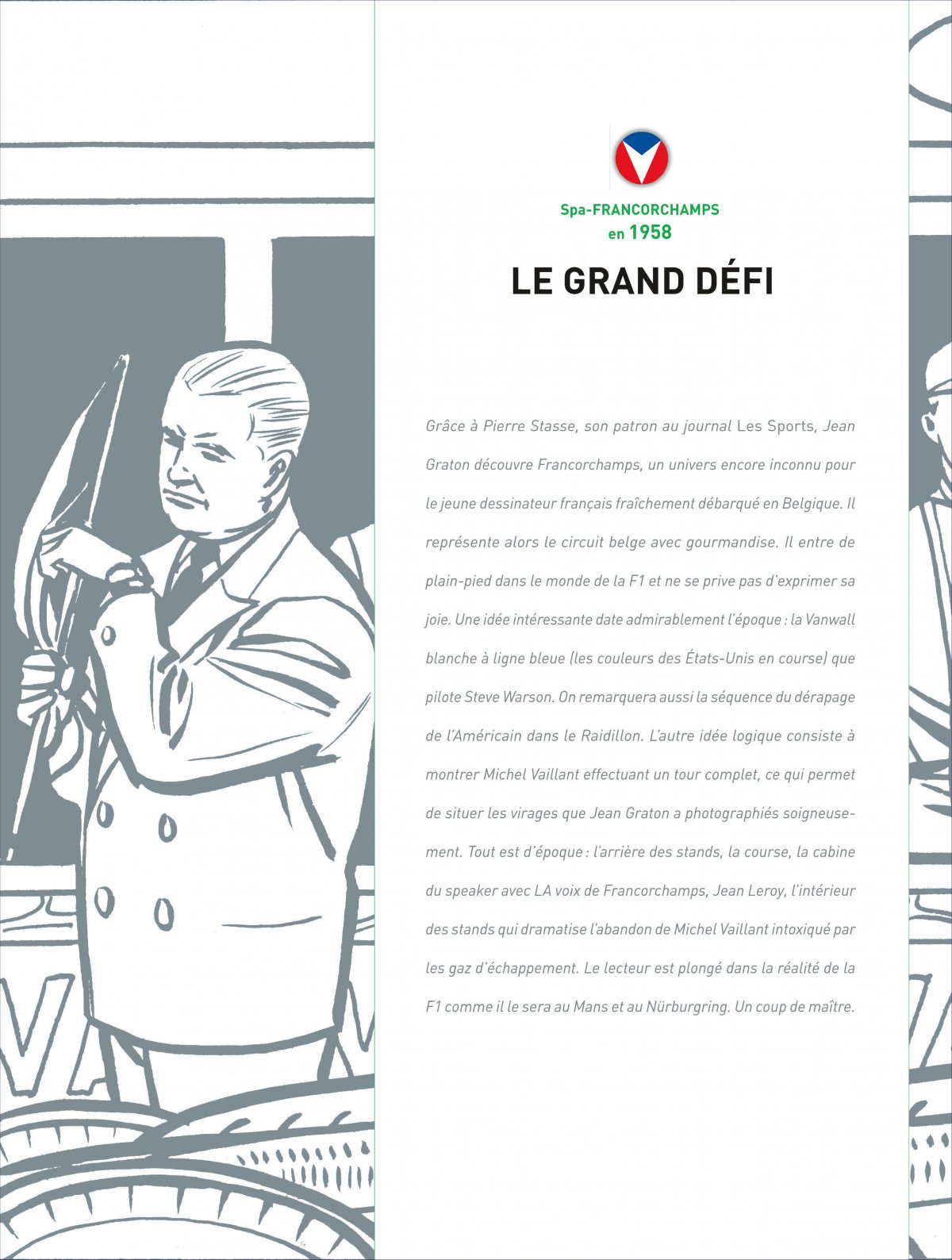Le circuit de Spa Francorchamps fait partie des hauts lieux de la course automobile. Circuit mythique, il apparaît dans de nombreuses aventures de Michel Vaillant. Pour raconter l’histoire de ce lieu légendaire, Alain van den Abeele et Jean Graton remontent le fil de la fiction et nous invitent à la découverte des grands moments de Spa-Francorchamps.